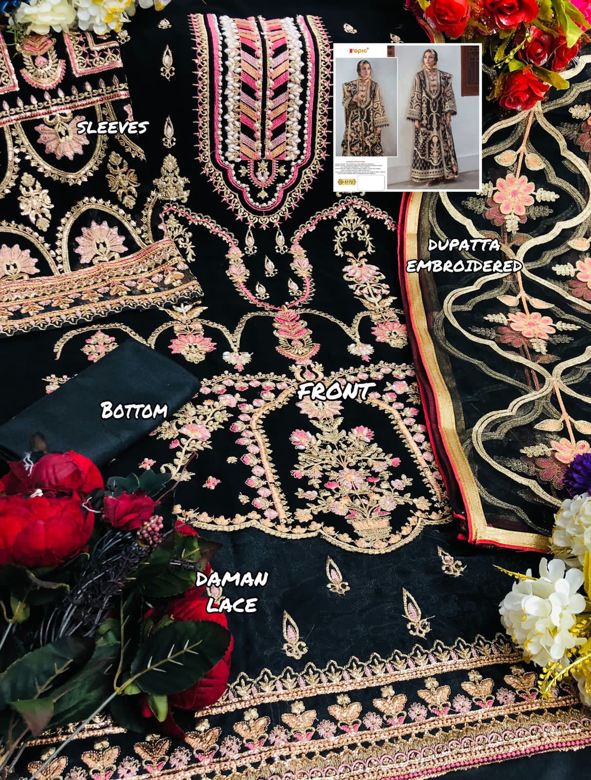 _*BRAND NAME*_:- FEPIC _*CATALOUGE NAME*_:- ROSEMEEN _*D NO*_:- D 5172 _*Top*_:- EMBROIDERED GEORGETTE WITH HEAVY HANDWORK _*Dupatta*_:- BUTTERFLY NET WITH HEAVY EMBROIDERY _*Bottom*_:- SANTOON _*INNER*_:-SANTOON _*RATE*_:- 1399/- 100+single |