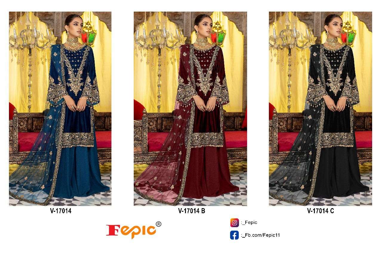 Buy Online ROSEMEEN D NO V 17014 by FEPIC VELVET suit collection manufacturer surat 3 Pcs of Full Catalogue at Wholesale Price. Looking for ROSEMEEN D NO V 17014 by FEPIC VELVET suit collection manufacturer surat Full Catalouge at Best Price? Buy Now ROSEMEEN D NO V 17014 by FEPIC VELVET suit collection manufacturer surat at Wholesale Rate of Rs 4197 with Total 3 Pcs from authroized dealer and supplier of FEPIC Brand. Cost of Each piece is just only Rs 1399 which is very low and affordable price to resale the product in your retail store ,This is Surat based Wholesale Supplier & Dealer of FEPIC Brand. Click on Brand name to Know more about FEPIC Brand's products.Call or Whatsapp on 9898838984 for booking or enquiry