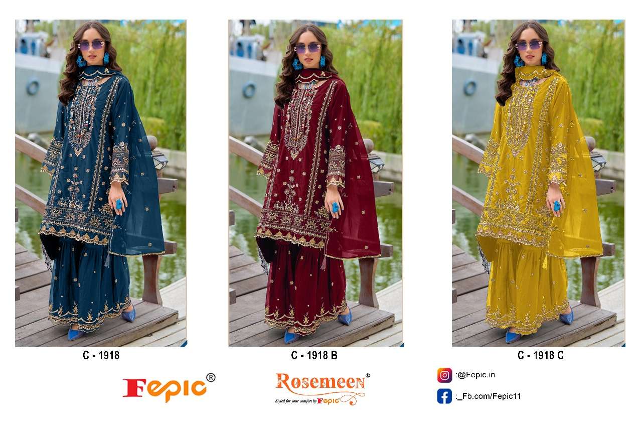 Buy Online ROSEMEEN D NO1918 By FEPIC ORGANZA suit collection manufacturer surat 3 Pcs of Full Catalogue at Wholesale Price. Looking for ROSEMEEN D NO1918 By FEPIC ORGANZA suit collection manufacturer surat Full Catalouge at Best Price? Buy Now ROSEMEEN D NO1918 By FEPIC ORGANZA suit collection manufacturer surat at Wholesale Rate of Rs 4713 with Total 3 Pcs from authroized dealer and supplier of FEPIC Brand. Cost of Each piece is just only Rs 1571 which is very low and affordable price to resale the product in your retail store ,This is Surat based Wholesale Supplier & Dealer of FEPIC Brand. Click on Brand name to Know more about FEPIC Brand's products.Call or Whatsapp on 9898838984 for booking or enquiry