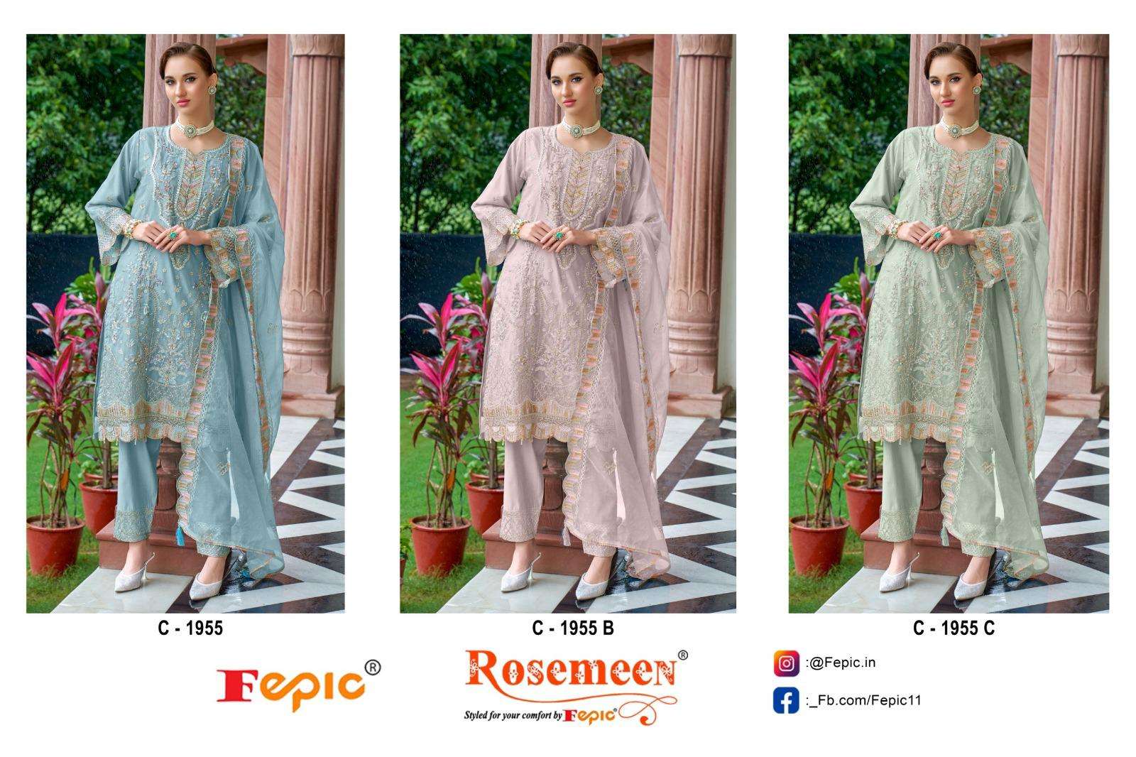 Buy Online ROSEMEEN D NO1955 by FEPIC ORGANZA suit collection manufacturer surat 3 Pcs of Full Catalogue at Wholesale Price. Looking for ROSEMEEN D NO1955 by FEPIC ORGANZA suit collection manufacturer surat Full Catalouge at Best Price? Buy Now ROSEMEEN D NO1955 by FEPIC ORGANZA suit collection manufacturer surat at Wholesale Rate of Rs 4047 with Total 3 Pcs from authroized dealer and supplier of FEPIC Brand. Cost of Each piece is just only Rs 1349 which is very low and affordable price to resale the product in your retail store ,This is Surat based Wholesale Supplier & Dealer of FEPIC Brand. Click on Brand name to Know more about FEPIC Brand's products.Call or Whatsapp on 9898838984 for booking or enquiry