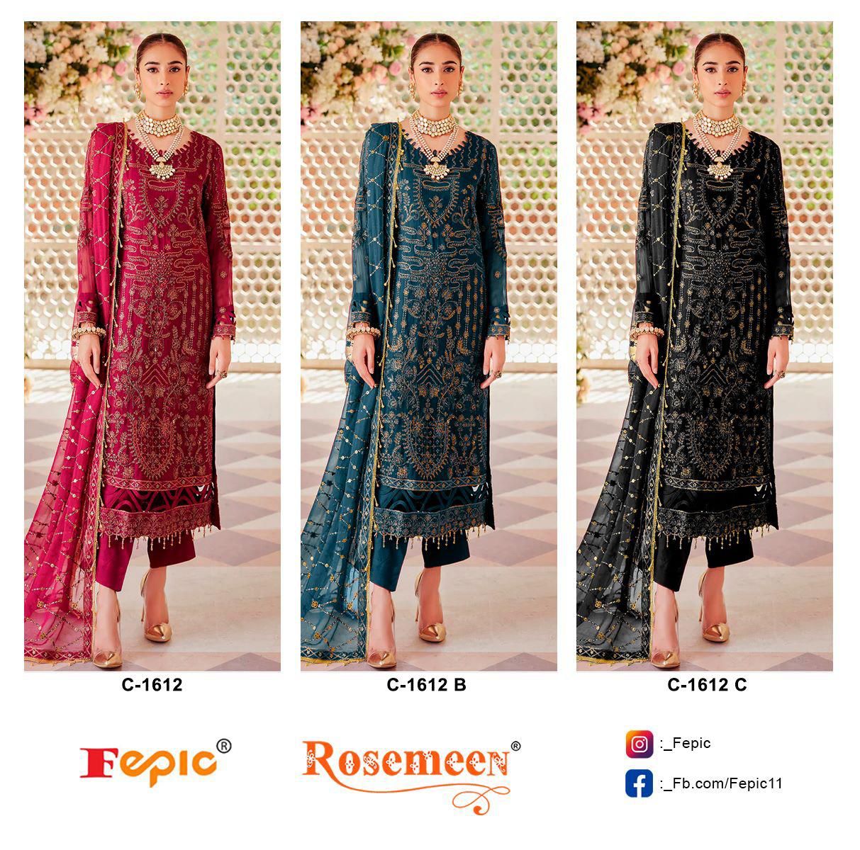 Buy Online Rosemeen F 1612 Fepic Georgette Embroidered Collection 3 Pcs of Full Catalogue at Wholesale Price. Looking for Rosemeen F 1612 Fepic Georgette Embroidered Collection Full Catalouge at Best Price? Buy Now Rosemeen F 1612 Fepic Georgette Embroidered Collection at Wholesale Rate of Rs 3777 with Total 3 Pcs from authroized dealer and supplier of FEPIC Brand. Cost of Each piece is just only Rs 1259 which is very low and affordable price to resale the product in your retail store ,This is Surat based Wholesale Supplier & Dealer of FEPIC Brand. Click on Brand name to Know more about FEPIC Brand's products.Call or Whatsapp on 9898838984 for booking or enquiry