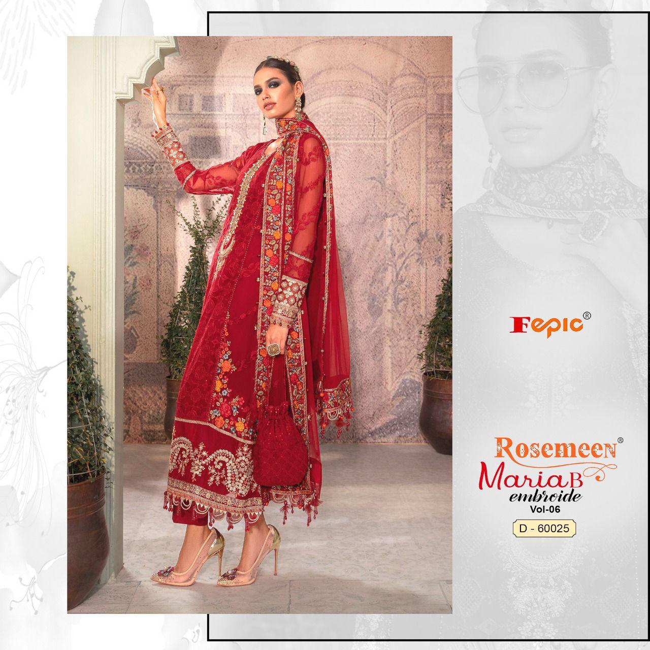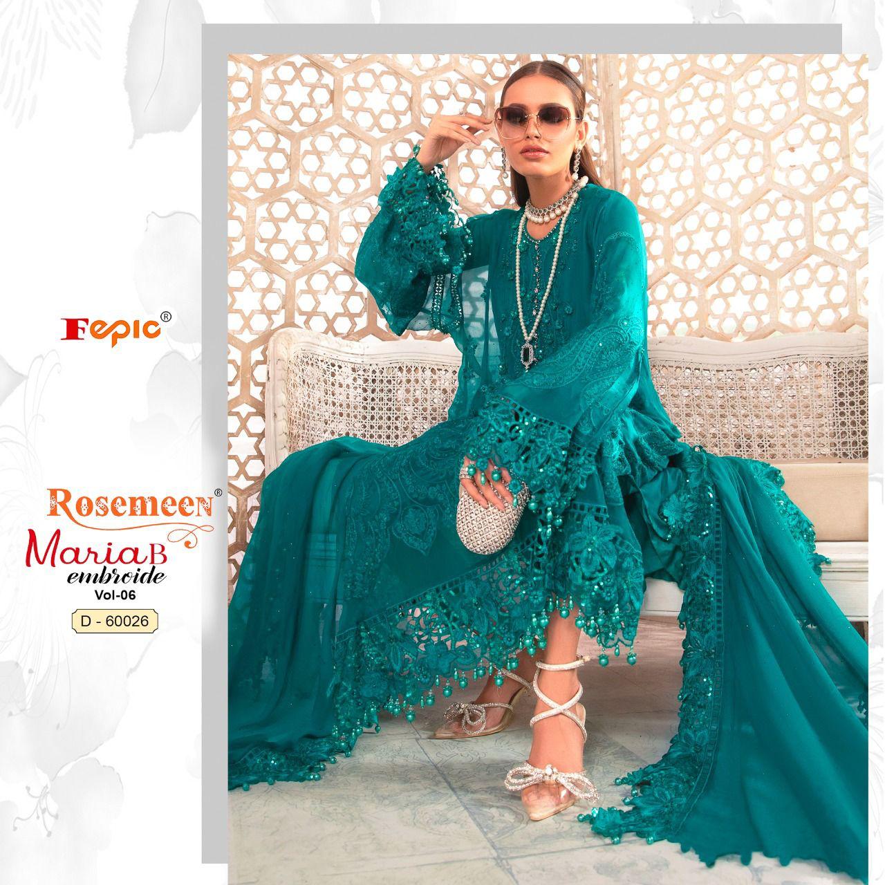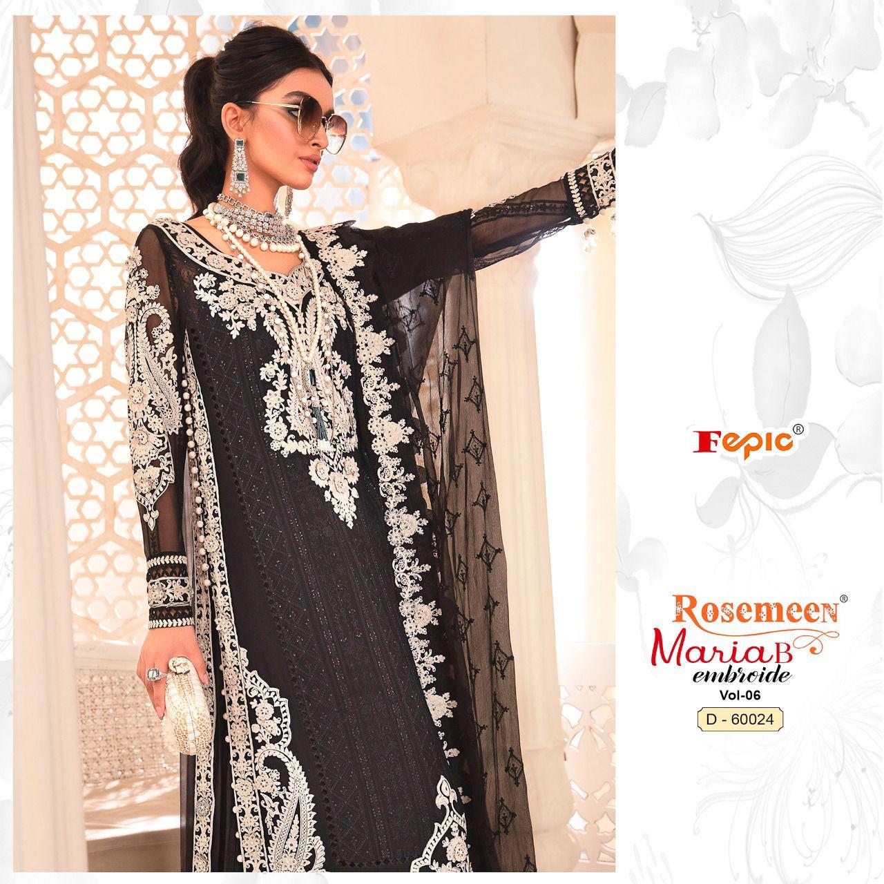 Buy Online Rosemeen Maria B Embroide Vol 6 By Fepic Georgette Suit Pakistani Collection Wholesaler Supplier From Surat 6 Pcs of Full Catalogue at Wholesale Price. Looking for Rosemeen Maria B Embroide Vol 6 By Fepic Georgette Suit Pakistani Collection Wholesaler Supplier From Surat Full Catalouge at Best Price? Buy Now Rosemeen Maria B Embroide Vol 6 By Fepic Georgette Suit Pakistani Collection Wholesaler Supplier From Surat at Wholesale Rate of Rs 7770 with Total 6 Pcs from authroized dealer and supplier of FEPIC Brand. Cost of Each piece is just only Rs 1295 which is very low and affordable price to resale the product in your retail store ,This is Surat based Wholesale Supplier & Dealer of FEPIC Brand. Click on Brand name to Know more about FEPIC Brand's products.Call or Whatsapp on 9898838984 for booking or enquiry