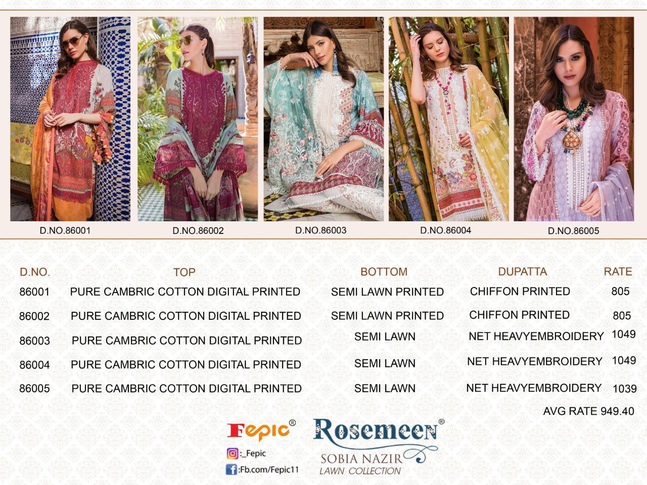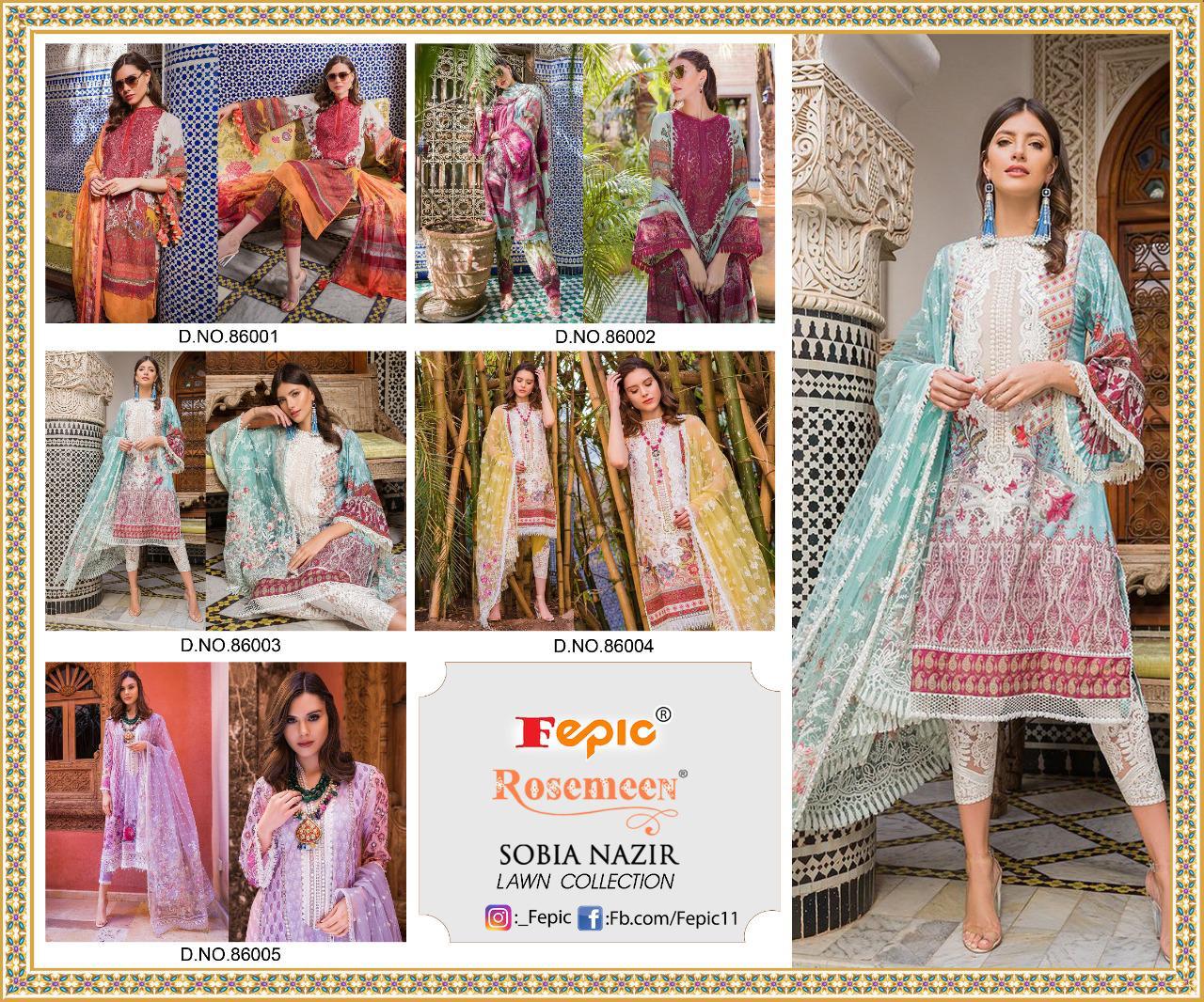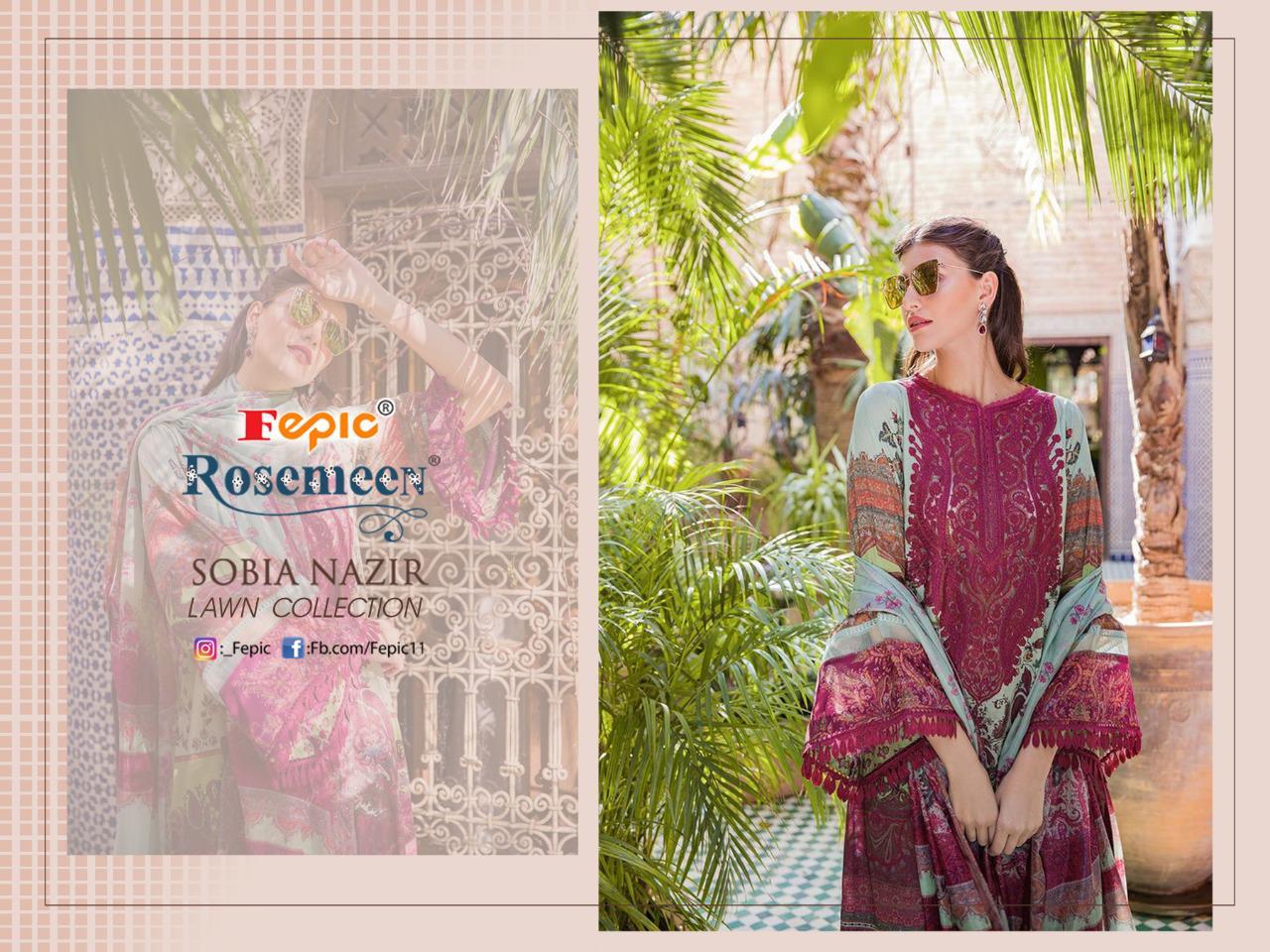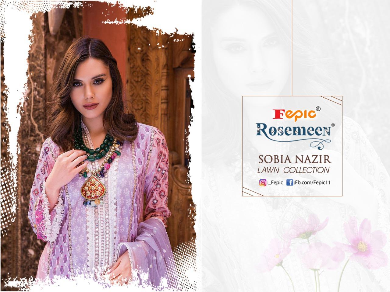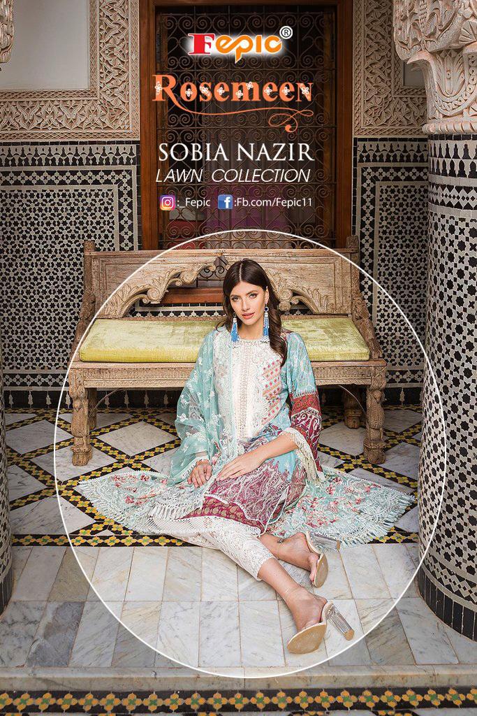 Buy Online Rosemeen Sobia Nazir Lawn Collection By Fepic Manufacturer Traders Surat 5 Pcs of Full Catalogue at Wholesale Price. Looking for Rosemeen Sobia Nazir Lawn Collection By Fepic Manufacturer Traders Surat Full Catalouge at Best Price? Buy Now Rosemeen Sobia Nazir Lawn Collection By Fepic Manufacturer Traders Surat at Wholesale Rate of Rs 4745 with Total 5 Pcs from authroized dealer and supplier of FEPIC Brand. Cost of Each piece is just only Rs 949 which is very low and affordable price to resale the product in your retail store ,This is Surat based Wholesale Supplier & Dealer of FEPIC Brand. Click on Brand name to Know more about FEPIC Brand's products.Call or Whatsapp on 9898838984 for booking or enquiry