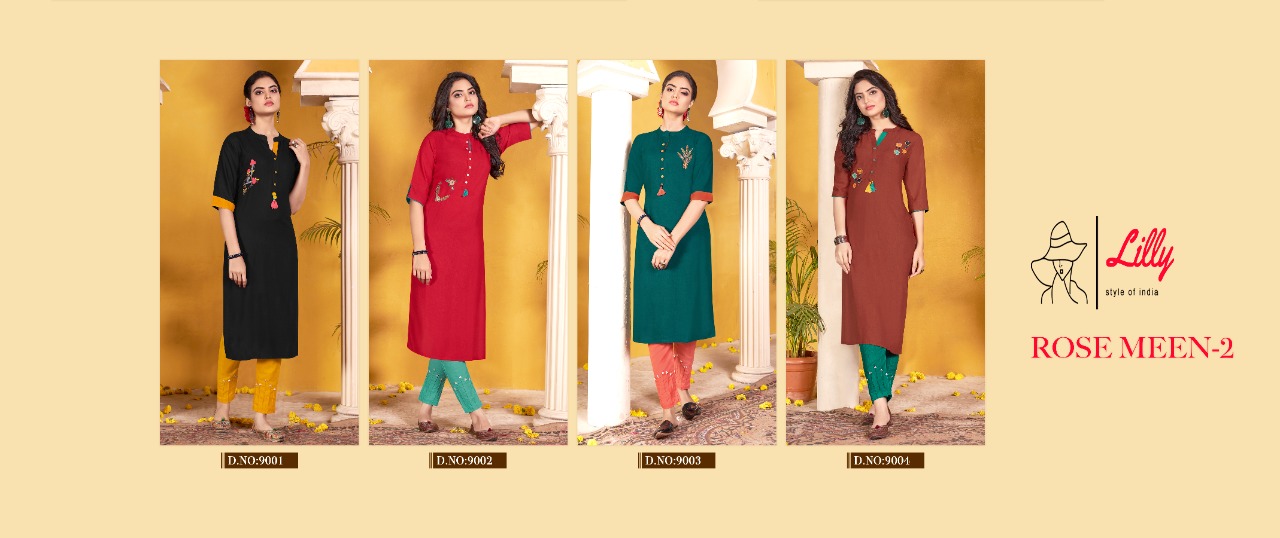 Buy Online Rosemeen Vol 2 By Lilly Style Of India Kurti With Pant Wholesaler Supplier From Surat 4 Pcs of Full Catalogue at Wholesale Price. Looking for Rosemeen Vol 2 By Lilly Style Of India Kurti With Pant Wholesaler Supplier From Surat Full Catalouge at Best Price? Buy Now Rosemeen Vol 2 By Lilly Style Of India Kurti With Pant Wholesaler Supplier From Surat at Wholesale Rate of Rs 2340 with Total 4 Pcs from authroized dealer and supplier of Brand. Cost of Each piece is just only Rs 585 which is very low and affordable price to resale the product in your retail store ,This is Surat based Wholesale Supplier & Dealer of Brand. Click on Brand name to Know more about Brand's products.Call or Whatsapp on 9898838984 for booking or enquiry