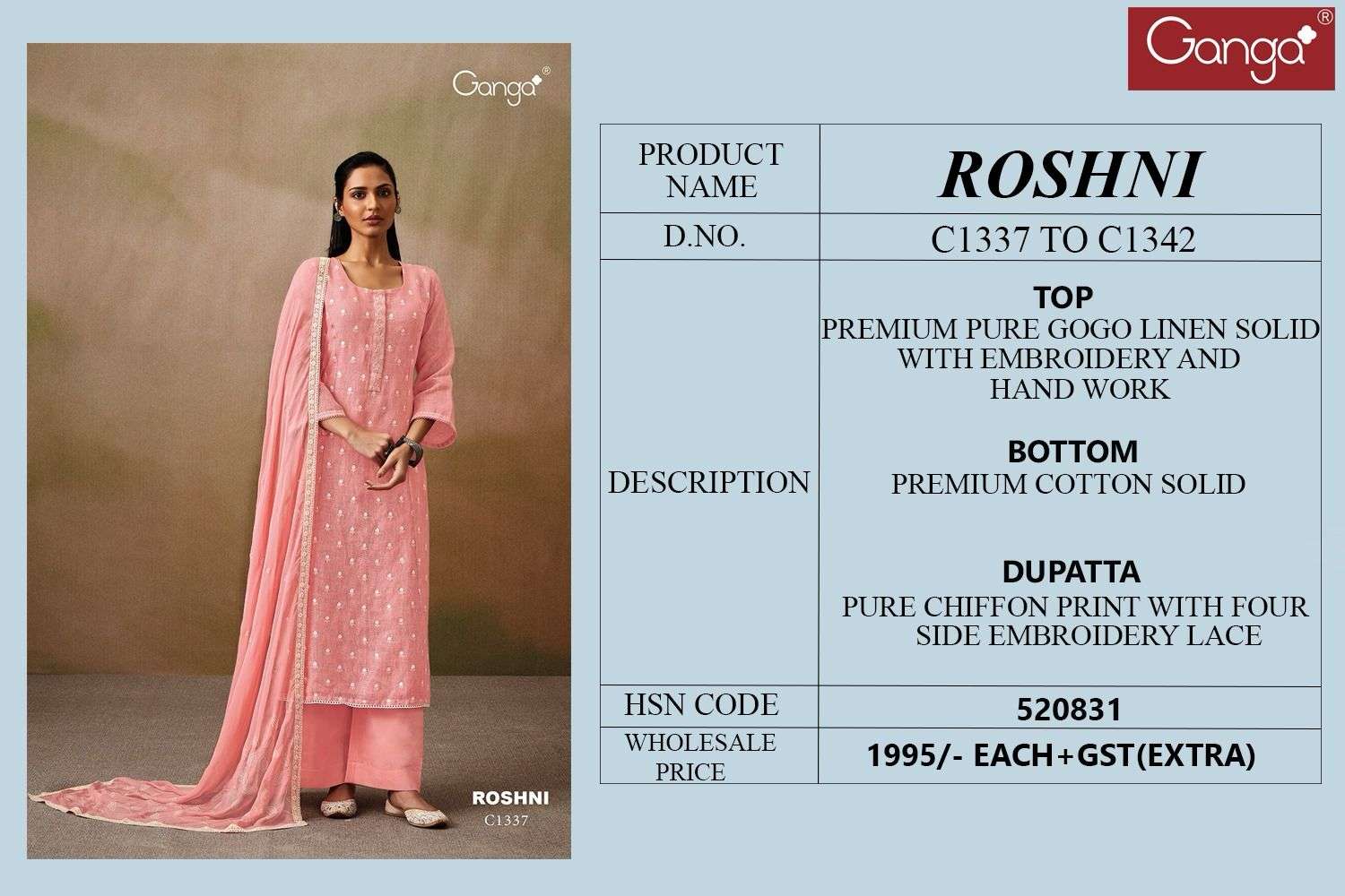 Buy Online ROSHNI by GANGA fancy suit collection manufacturer surat 6 Pcs of Full Catalogue at Wholesale Price. Looking for ROSHNI by GANGA fancy suit collection manufacturer surat Full Catalouge at Best Price? Buy Now ROSHNI by GANGA fancy suit collection manufacturer surat at Wholesale Rate of Rs 11970 with Total 6 Pcs from authroized dealer and supplier of GANGA Brand. Cost of Each piece is just only Rs 1995 which is very low and affordable price to resale the product in your retail store ,This is Surat based Wholesale Supplier & Dealer of GANGA Brand. Click on Brand name to Know more about GANGA Brand's products.Call or Whatsapp on 9898838984 for booking or enquiry