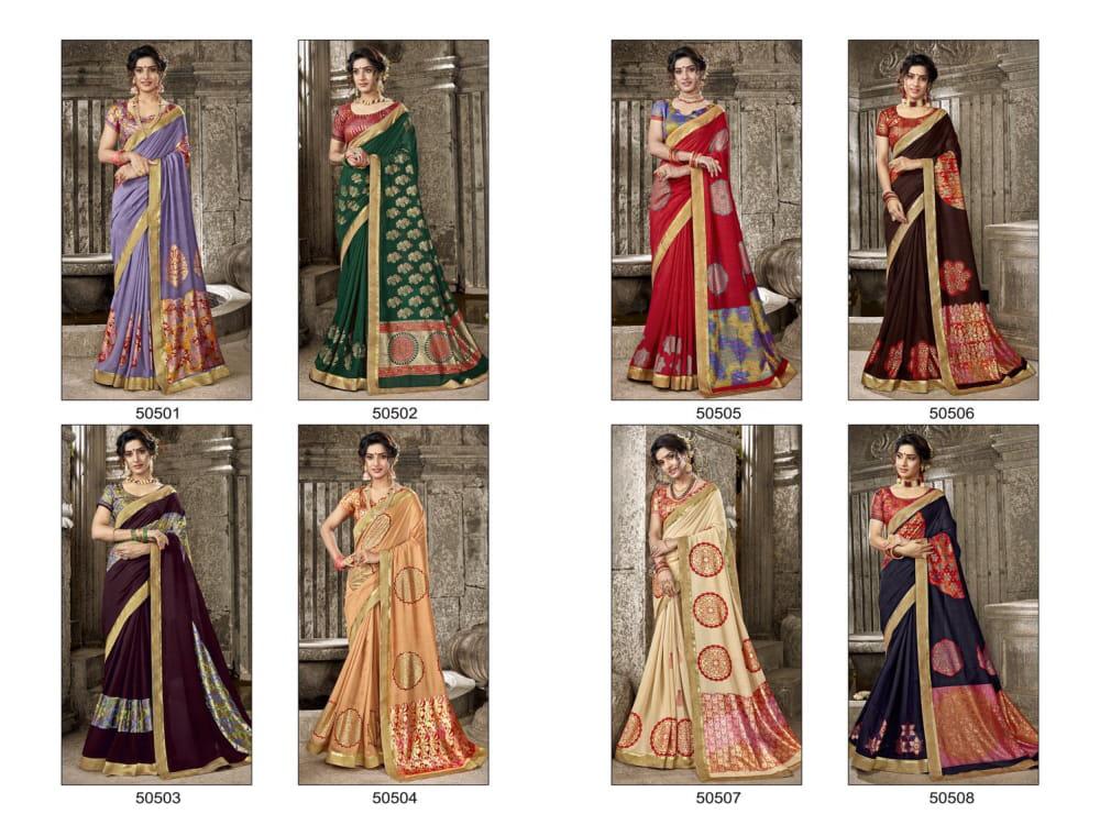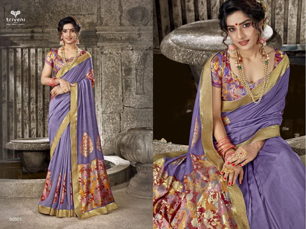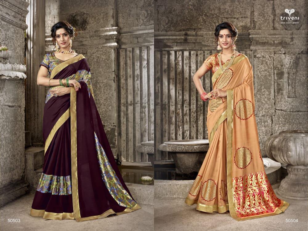 "Triveni presents ' ROSHNI ' @ INR 621/- Plus 5% GST If sarees are to go simple, play with the blouse designs. Plain sarees with printed & laced borders with few patches of prints on the sarees to bring in a fresh air of contemporary designs. Hereby, presenting one of a kind, a set of 8 sarees - Roshni by Triveni @ Rs. 621/-" Set to set Gst 5 % extra Delivery-2-3 din Book your order now |