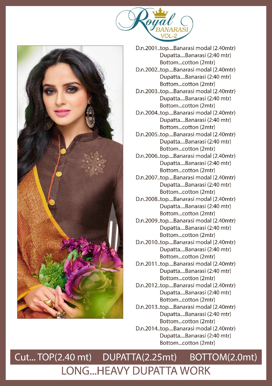 Buy Online Royal Banarasi Vol 2 By Shagun Series 2001 To 2014 Banarasi Model Salwaar Kameez Wholesale Supplier And Dealer Surat 14 Pcs of Full Catalogue at Wholesale Price. Looking for Royal Banarasi Vol 2 By Shagun Series 2001 To 2014 Banarasi Model Salwaar Kameez Wholesale Supplier And Dealer Surat Full Catalouge at Best Price? Buy Now Royal Banarasi Vol 2 By Shagun Series 2001 To 2014 Banarasi Model Salwaar Kameez Wholesale Supplier And Dealer Surat at Wholesale Rate of Rs 9730 with Total 14 Pcs from authroized dealer and supplier of Brand. Cost of Each piece is just only Rs 695 which is very low and affordable price to resale the product in your retail store ,This is Surat based Wholesale Supplier & Dealer of Brand. Click on Brand name to Know more about Brand's products.Call or Whatsapp on 9898838984 for booking or enquiry