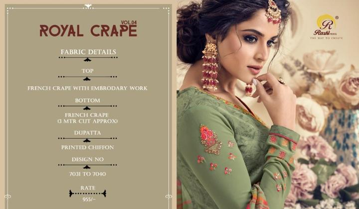 Buy Online Royal Crape Vol 4 By Rashi Series 7031 To 7040 Crepe Embroidered Designer Party Wear Suits Wholesale Supplier Gujarat 10 Pcs of Full Catalogue at Wholesale Price. Looking for Royal Crape Vol 4 By Rashi Series 7031 To 7040 Crepe Embroidered Designer Party Wear Suits Wholesale Supplier Gujarat Full Catalouge at Best Price? Buy Now Royal Crape Vol 4 By Rashi Series 7031 To 7040 Crepe Embroidered Designer Party Wear Suits Wholesale Supplier Gujarat at Wholesale Rate of Rs 9550 with Total 10 Pcs from authroized dealer and supplier of Rashi Prints Brand. Cost of Each piece is just only Rs 955 which is very low and affordable price to resale the product in your retail store ,This is Surat based Wholesale Supplier & Dealer of Rashi Prints Brand. Click on Brand name to Know more about Rashi Prints Brand's products.Call or Whatsapp on 9898838984 for booking or enquiry