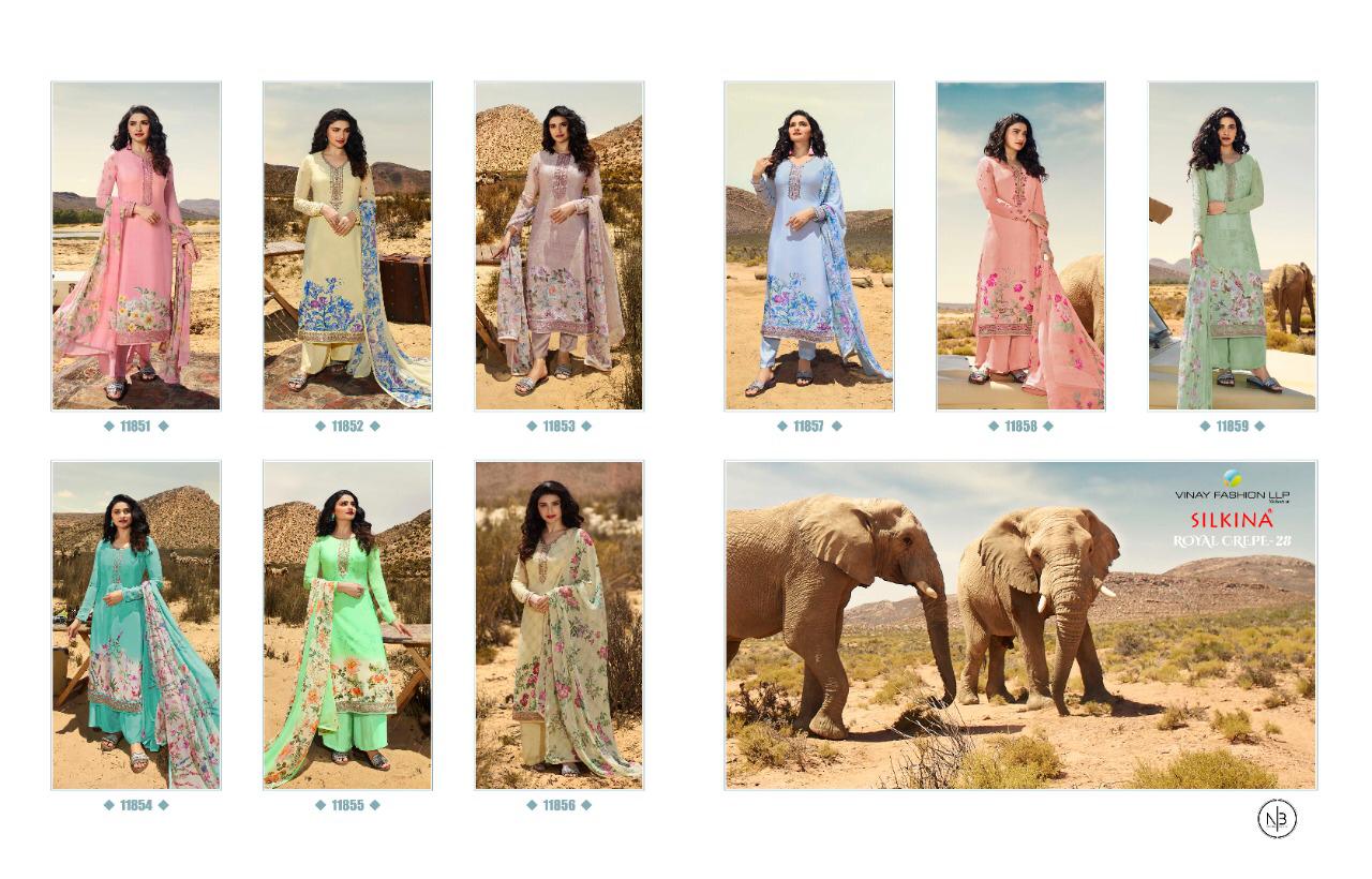 Buy Online Royal Crepe 28 By Vinay Fashion Series 11851 To 11859 Designer Party Wear Suits Wholesale Supplier Gujarat 9 Pcs of Full Catalogue at Wholesale Price. Looking for Royal Crepe 28 By Vinay Fashion Series 11851 To 11859 Designer Party Wear Suits Wholesale Supplier Gujarat Full Catalouge at Best Price? Buy Now Royal Crepe 28 By Vinay Fashion Series 11851 To 11859 Designer Party Wear Suits Wholesale Supplier Gujarat at Wholesale Rate of Rs 9585 with Total 9 Pcs from authroized dealer and supplier of VINAY Brand. Cost of Each piece is just only Rs 1065 which is very low and affordable price to resale the product in your retail store ,This is Surat based Wholesale Supplier & Dealer of VINAY Brand. Click on Brand name to Know more about VINAY Brand's products.Call or Whatsapp on 9898838984 for booking or enquiry