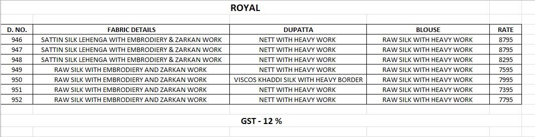 Brand - Royal . Catlog name - ROYAL VOL-11. Series - 946 to 952. * set & loose & singel * GST 12 Percent Extra. Delivery - READY Single rate ask personally |