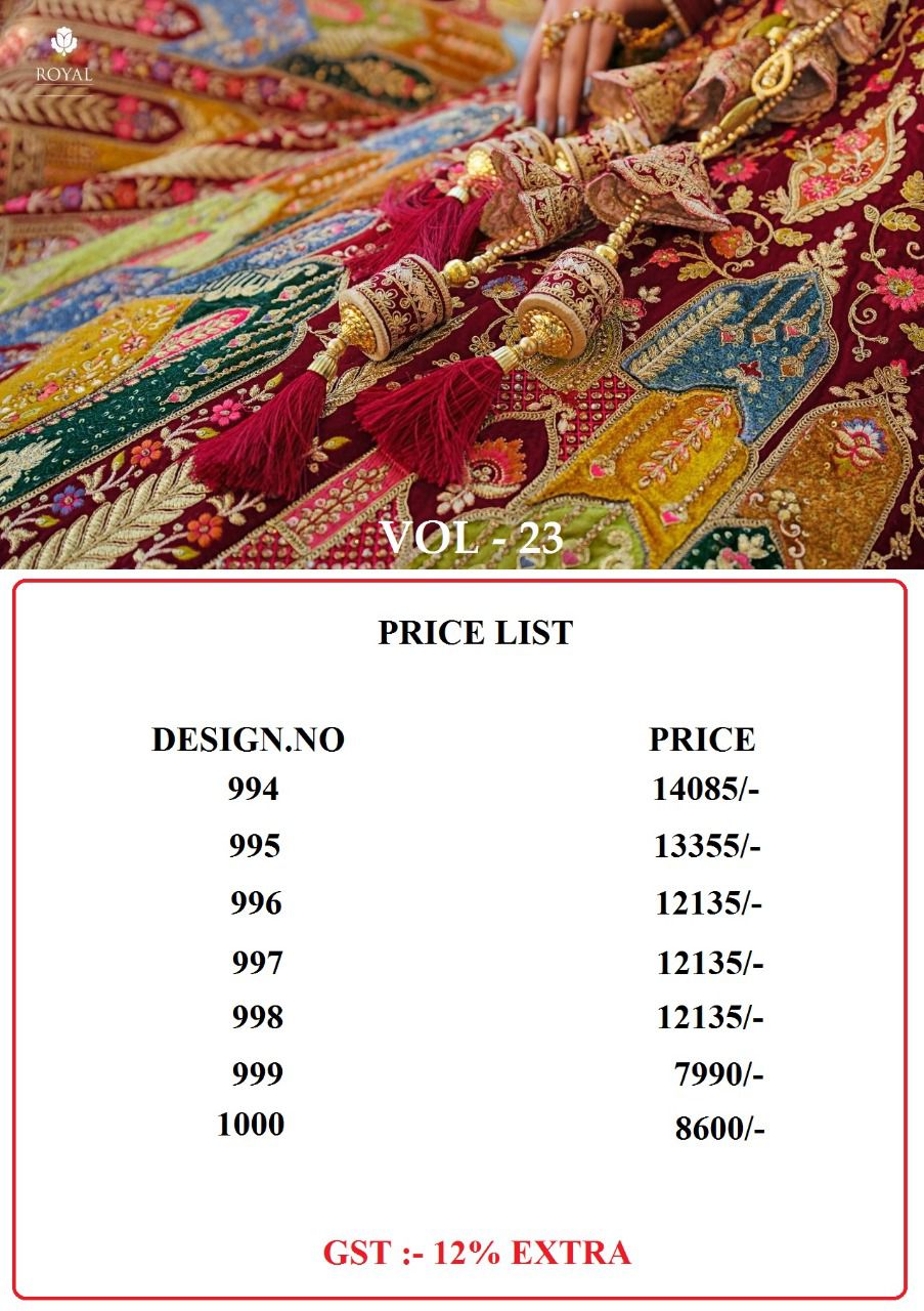 Buy Online Royal Vrindavan Vol 23 Lehenga Choli Single And Set Stockiest And Supplier From Surat 7 Pcs of Full Catalogue at Wholesale Price. Looking for Royal Vrindavan Vol 23 Lehenga Choli Single And Set Stockiest And Supplier From Surat Full Catalouge at Best Price? Buy Now Royal Vrindavan Vol 23 Lehenga Choli Single And Set Stockiest And Supplier From Surat at Wholesale Rate of Rs 0 with Total 7 Pcs from authroized dealer and supplier of ROYAL Brand. Cost of Each piece is just only Rs 0 which is very low and affordable price to resale the product in your retail store ,This is Surat based Wholesale Supplier & Dealer of ROYAL Brand. Click on Brand name to Know more about ROYAL Brand's products.Call or Whatsapp on 9898838984 for booking or enquiry