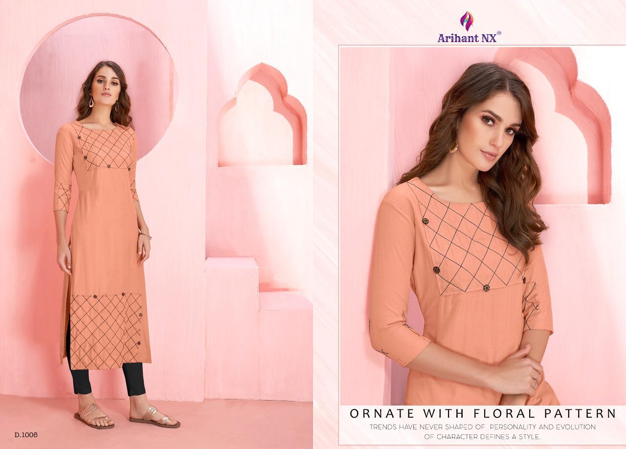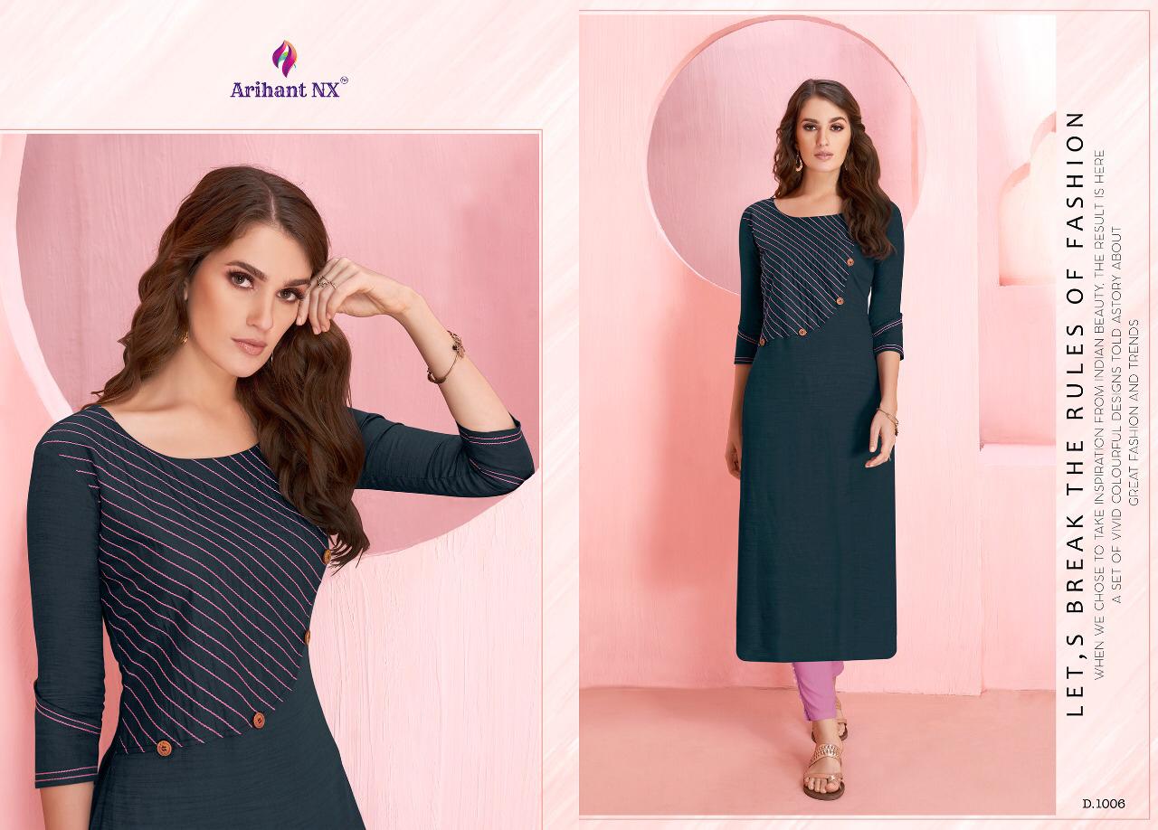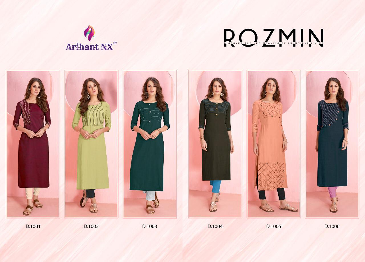 Buy Online Rozmin By Arihant Nx Series 1001 To 1006 Reyon Kurtis Wholesale Supplier And Dealer Surat 6 Pcs of Full Catalogue at Wholesale Price. Looking for Rozmin By Arihant Nx Series 1001 To 1006 Reyon Kurtis Wholesale Supplier And Dealer Surat Full Catalouge at Best Price? Buy Now Rozmin By Arihant Nx Series 1001 To 1006 Reyon Kurtis Wholesale Supplier And Dealer Surat at Wholesale Rate of Rs 1770 with Total 6 Pcs from authroized dealer and supplier of ARIHANT NX Brand. Cost of Each piece is just only Rs 295 which is very low and affordable price to resale the product in your retail store ,This is Surat based Wholesale Supplier & Dealer of ARIHANT NX Brand. Click on Brand name to Know more about ARIHANT NX Brand's products.Call or Whatsapp on 9898838984 for booking or enquiry
