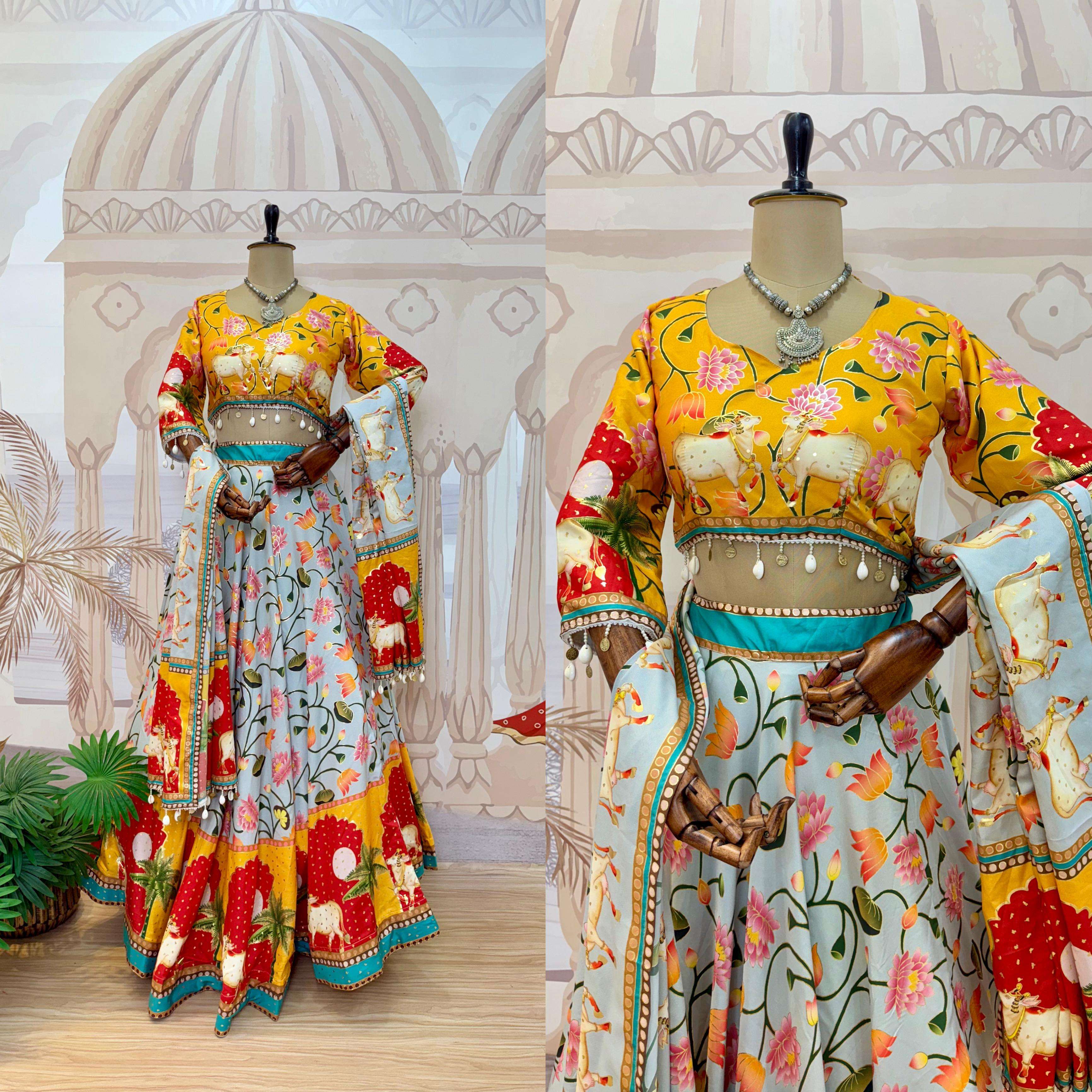 👉 *Lehenga Details* *Fabric:- FOIL PRINT ON CREPE SILK FABRIC* *Work :- CAN-CAN, CANVAS & DRAWSTRING WITH LATAKAN* *Flair :- 8 METER* *Height :- 42 Inch*