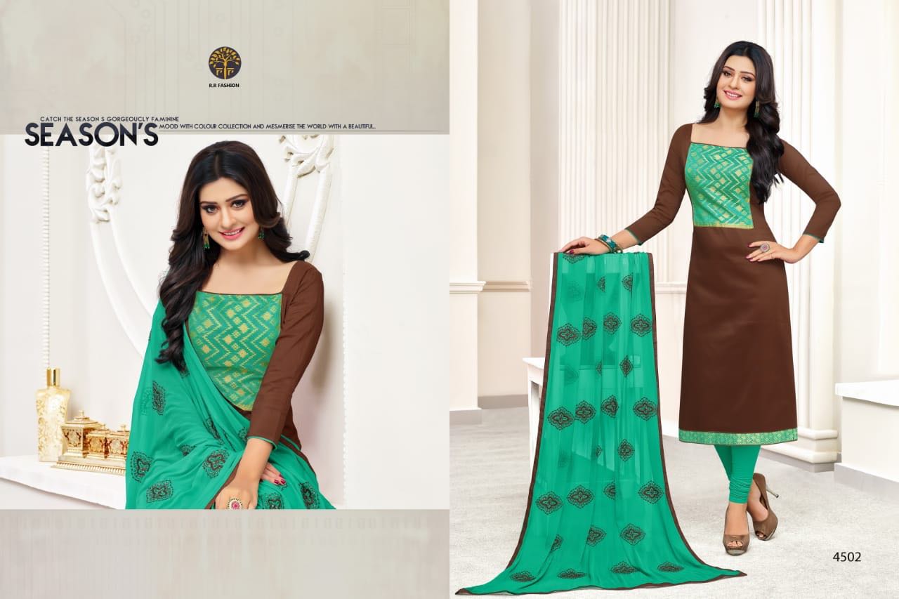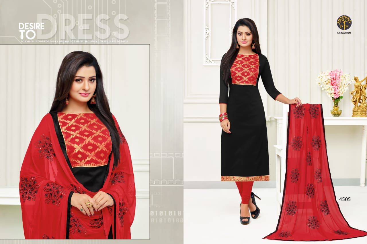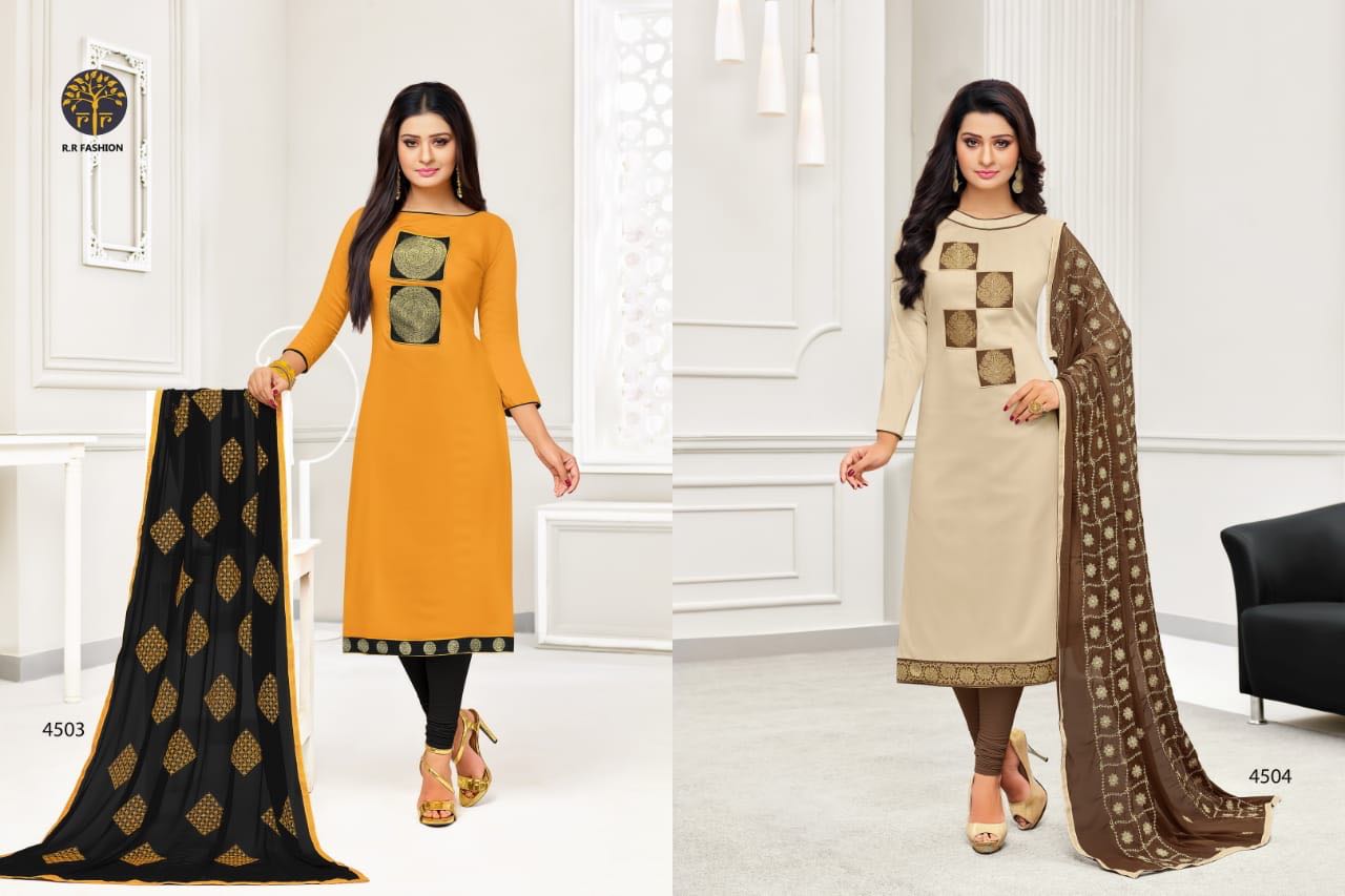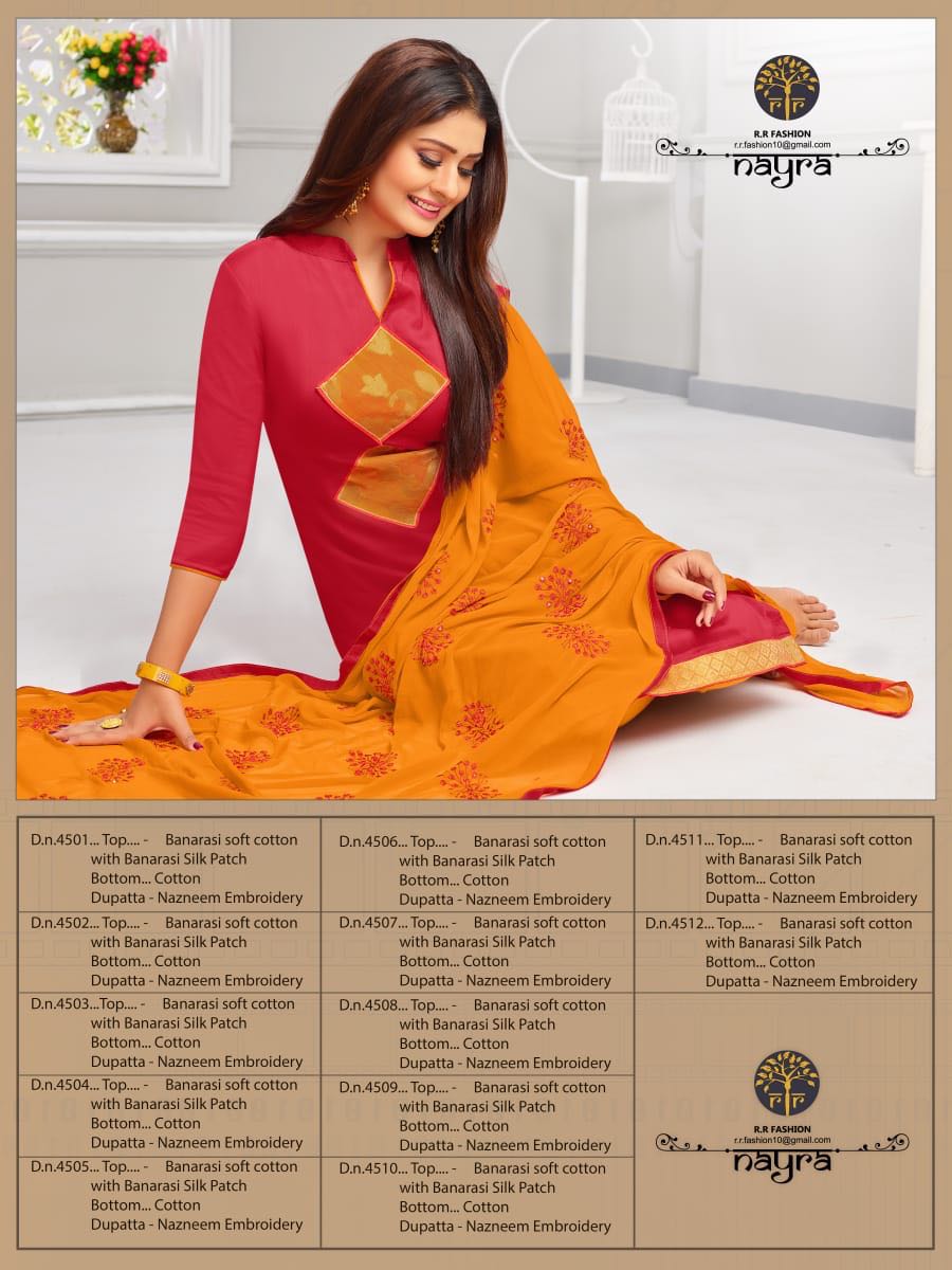 Buy Online Rr Fashion Nayra 4501 Series Fancy Salwar Kameez Catlog Wholesaler Surat 12 Pcs of Full Catalogue at Wholesale Price. Looking for Rr Fashion Nayra 4501 Series Fancy Salwar Kameez Catlog Wholesaler Surat Full Catalouge at Best Price? Buy Now Rr Fashion Nayra 4501 Series Fancy Salwar Kameez Catlog Wholesaler Surat at Wholesale Rate of Rs 7020 with Total 12 Pcs from authroized dealer and supplier of RR fashion Brand. Cost of Each piece is just only Rs 585 which is very low and affordable price to resale the product in your retail store ,This is Surat based Wholesale Supplier & Dealer of RR fashion Brand. Click on Brand name to Know more about RR fashion Brand's products.Call or Whatsapp on 9898838984 for booking or enquiry