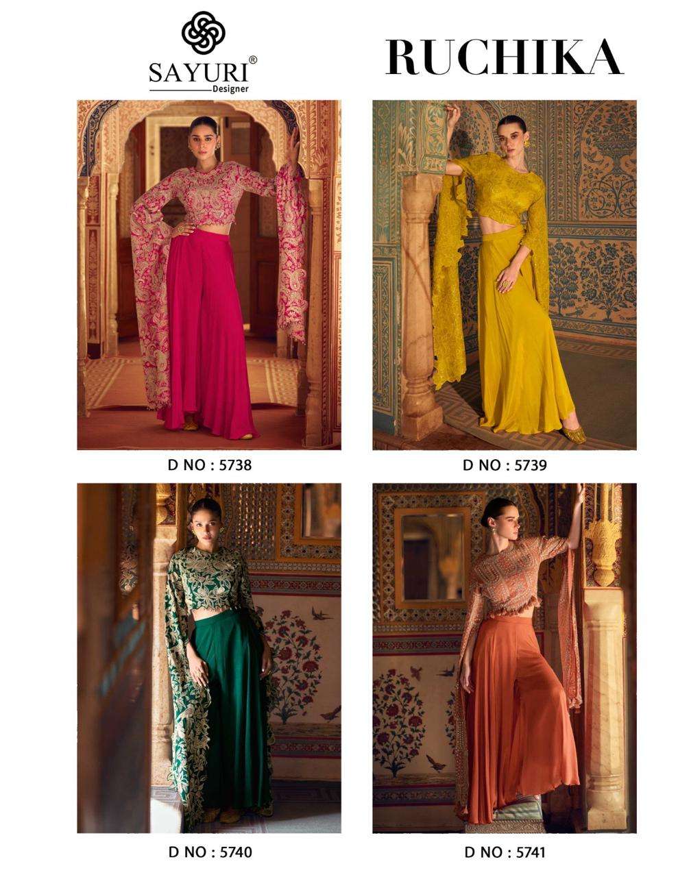 Buy Online RUCHIKA by SAYURI DESIGNER CHINON SILK PLAZZO suit collection manufacturer surat 4 Pcs of Full Catalogue at Wholesale Price. Looking for RUCHIKA by SAYURI DESIGNER CHINON SILK PLAZZO suit collection manufacturer surat Full Catalouge at Best Price? Buy Now RUCHIKA by SAYURI DESIGNER CHINON SILK PLAZZO suit collection manufacturer surat at Wholesale Rate of Rs 11596 with Total 4 Pcs from authroized dealer and supplier of SAYURI DESIGNER Brand. Cost of Each piece is just only Rs 2899 which is very low and affordable price to resale the product in your retail store ,This is Surat based Wholesale Supplier & Dealer of SAYURI DESIGNER Brand. Click on Brand name to Know more about SAYURI DESIGNER Brand's products.Call or Whatsapp on 9898838984 for booking or enquiry