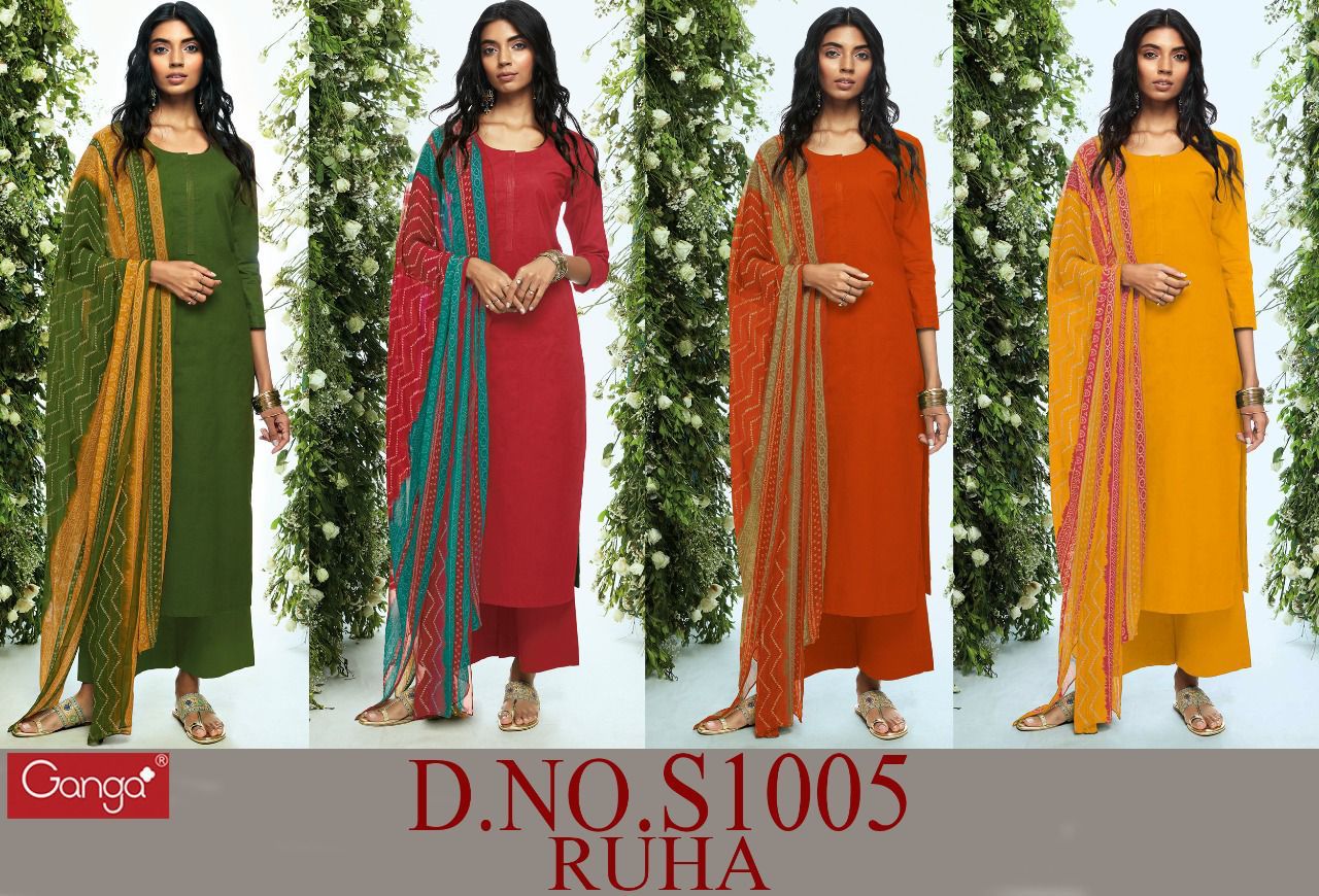 Buy Online Ruha 1005 By Ganga Designer Suits Wholesale Suppliers And Dealer From India 4 Pcs of Full Catalogue at Wholesale Price. Looking for Ruha 1005 By Ganga Designer Suits Wholesale Suppliers And Dealer From India Full Catalouge at Best Price? Buy Now Ruha 1005 By Ganga Designer Suits Wholesale Suppliers And Dealer From India at Wholesale Rate of Rs 3840 with Total 4 Pcs from authroized dealer and supplier of GANGA Brand. Cost of Each piece is just only Rs 960 which is very low and affordable price to resale the product in your retail store ,This is Surat based Wholesale Supplier & Dealer of GANGA Brand. Click on Brand name to Know more about GANGA Brand's products.Call or Whatsapp on 9898838984 for booking or enquiry