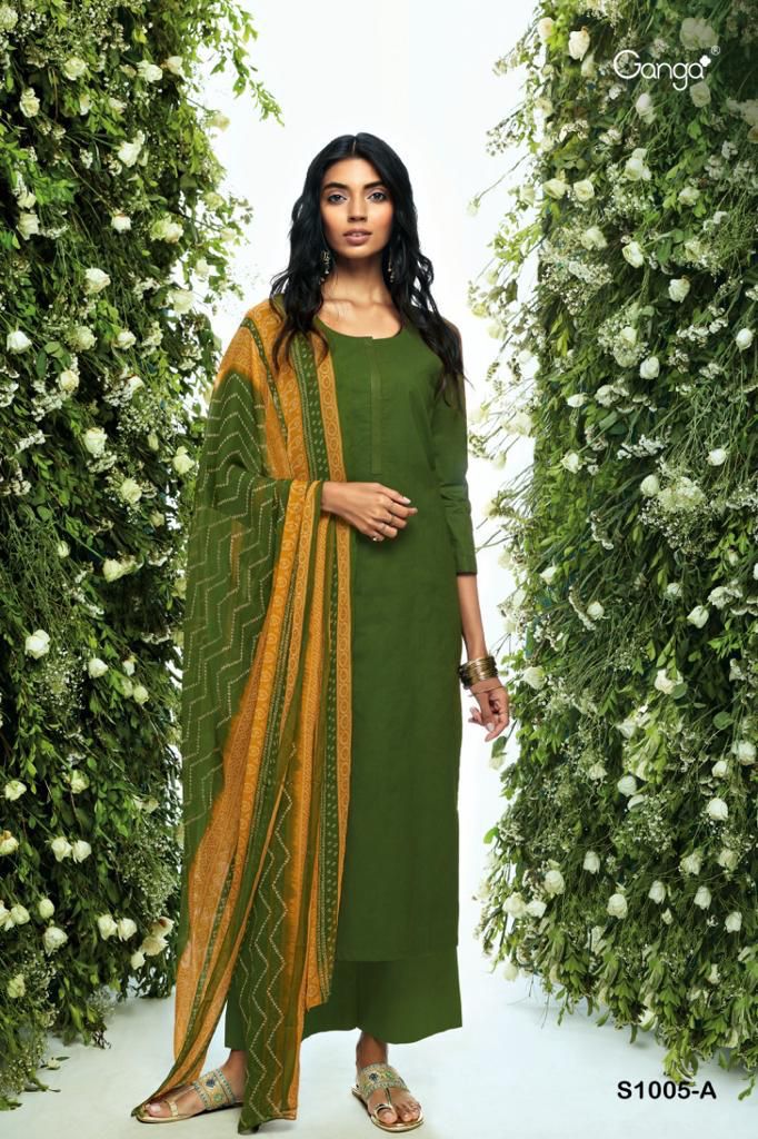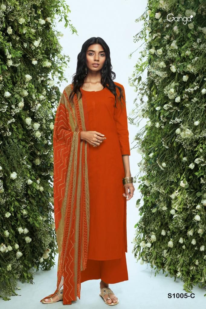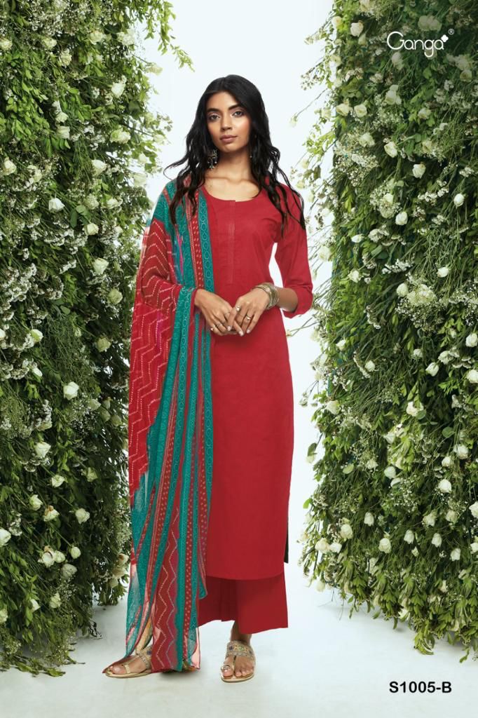 *GANGA* RUHA 1005 *TOP/BOTTOM:* PREMIUM COTTON SOLID (5MTRS) *DUPATTA:* PURE CHIFFON PRINTED *RATE:* 960/- |