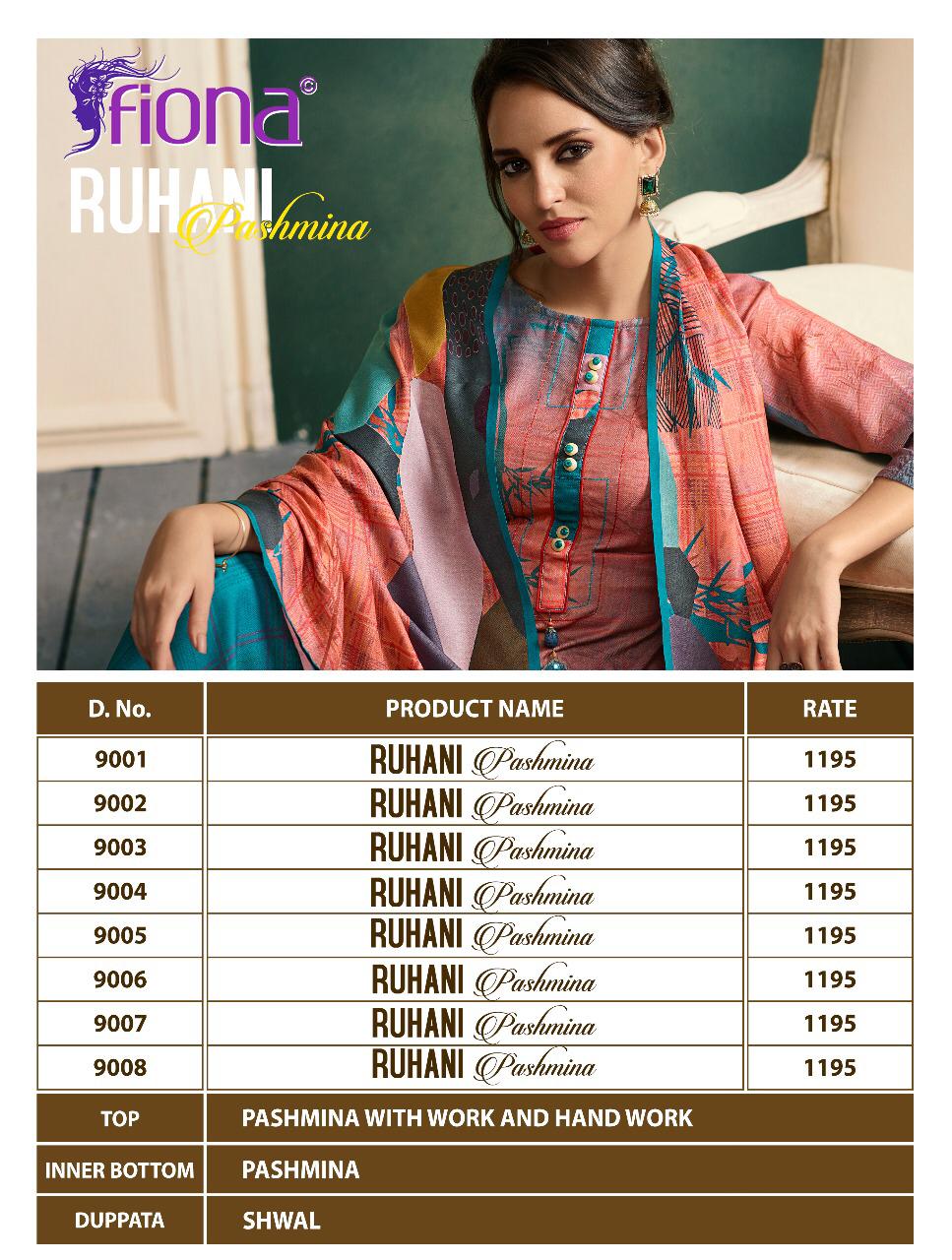 Buy Online Ruhani Pashmina By Fiona 9001 Series Fancy Party Wear Pashmina Salwar Kameez Catlog Wholesaler Surat 8 Pcs of Full Catalogue at Wholesale Price. Looking for Ruhani Pashmina By Fiona 9001 Series Fancy Party Wear Pashmina Salwar Kameez Catlog Wholesaler Surat Full Catalouge at Best Price? Buy Now Ruhani Pashmina By Fiona 9001 Series Fancy Party Wear Pashmina Salwar Kameez Catlog Wholesaler Surat at Wholesale Rate of Rs 9560 with Total 8 Pcs from authroized dealer and supplier of FIONA Brand. Cost of Each piece is just only Rs 1195 which is very low and affordable price to resale the product in your retail store ,This is Surat based Wholesale Supplier & Dealer of FIONA Brand. Click on Brand name to Know more about FIONA Brand's products.Call or Whatsapp on 9898838984 for booking or enquiry