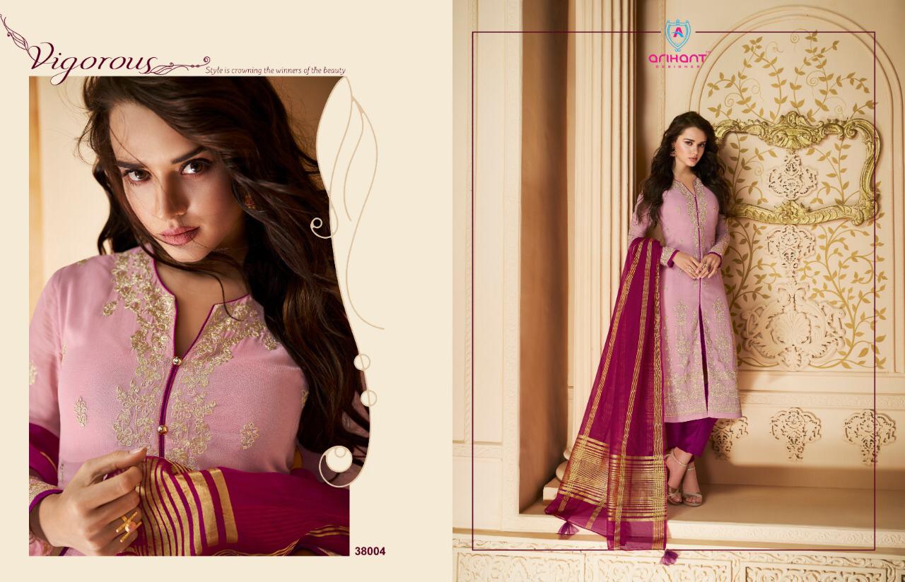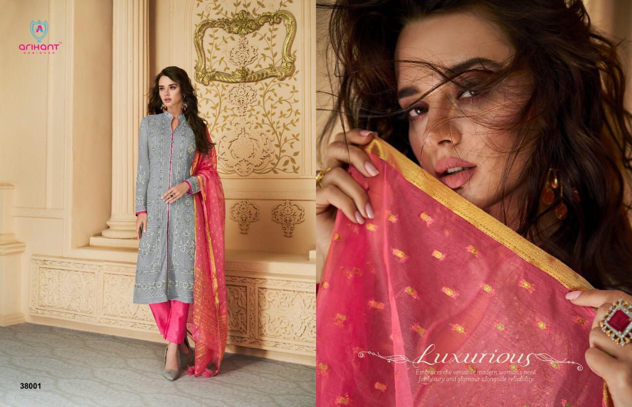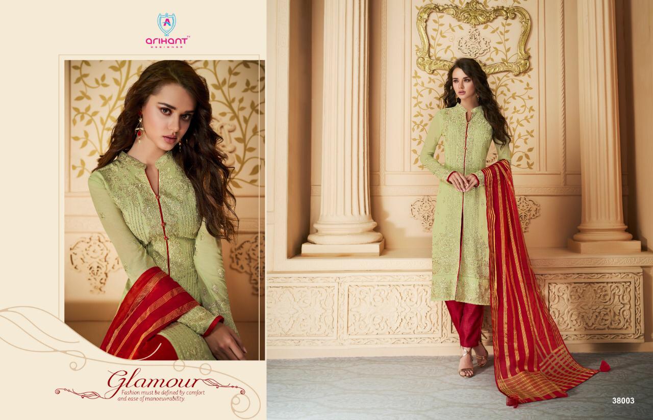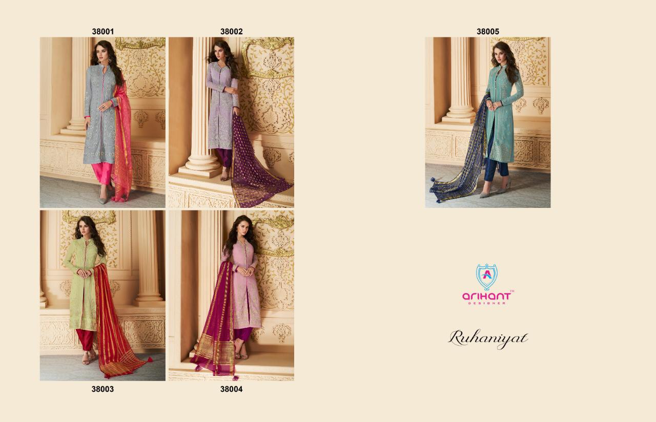Buy Online Ruhaniyat By Arihant Designer 38001 Series Fancy Party Wear Apple Georgette Salwar Kameez Catlog Wholesaler Surat 5 Pcs of Full Catalogue at Wholesale Price. Looking for Ruhaniyat By Arihant Designer 38001 Series Fancy Party Wear Apple Georgette Salwar Kameez Catlog Wholesaler Surat Full Catalouge at Best Price? Buy Now Ruhaniyat By Arihant Designer 38001 Series Fancy Party Wear Apple Georgette Salwar Kameez Catlog Wholesaler Surat at Wholesale Rate of Rs 6250 with Total 5 Pcs from authroized dealer and supplier of ARIHANT Brand. Cost of Each piece is just only Rs 1250 which is very low and affordable price to resale the product in your retail store ,This is Surat based Wholesale Supplier & Dealer of ARIHANT Brand. Click on Brand name to Know more about ARIHANT Brand's products.Call or Whatsapp on 9898838984 for booking or enquiry