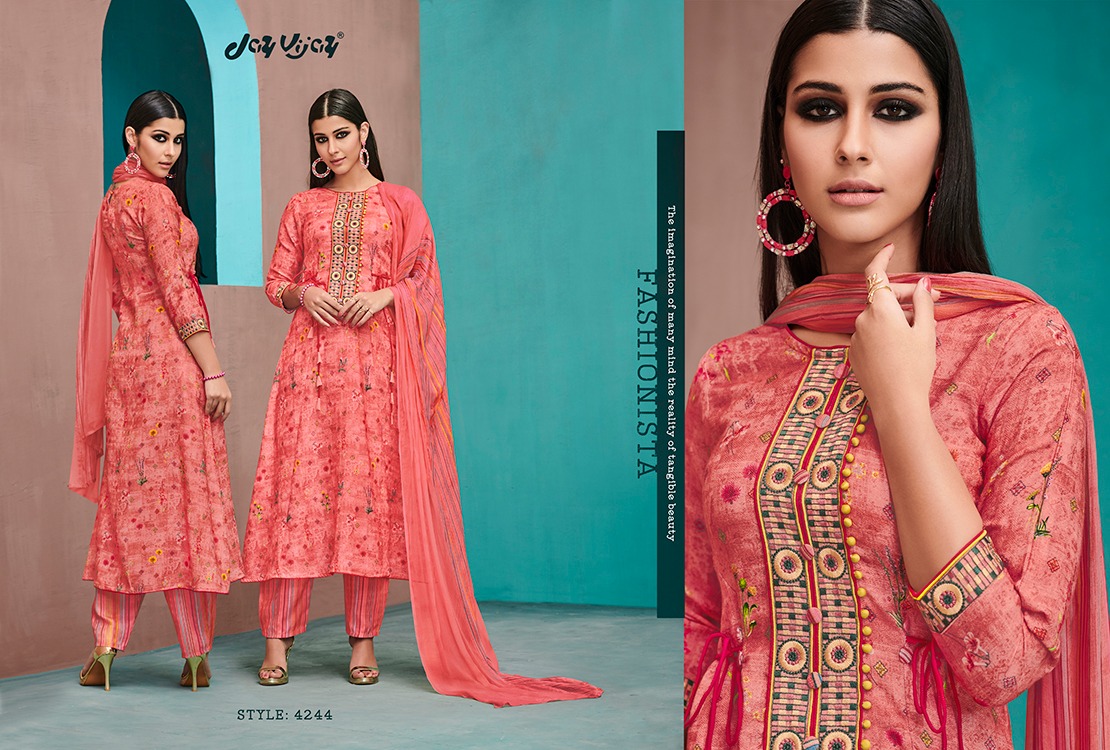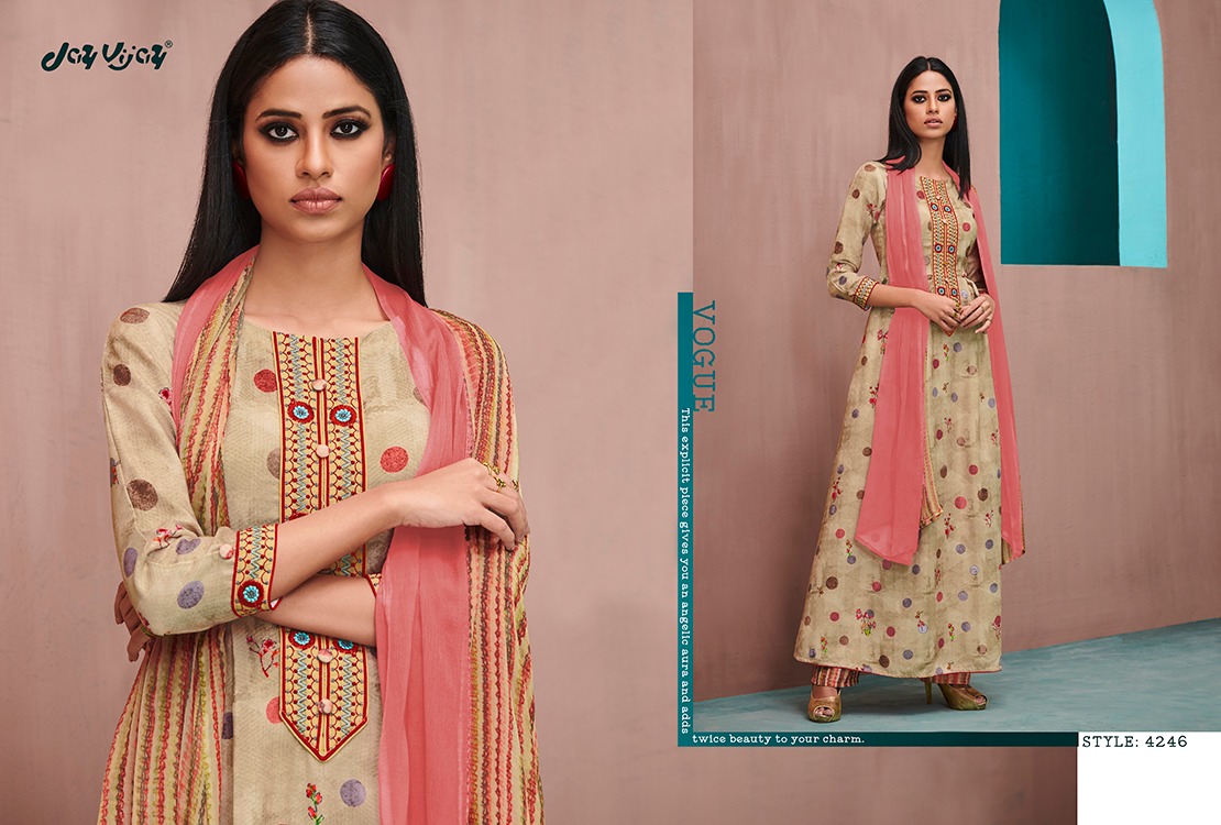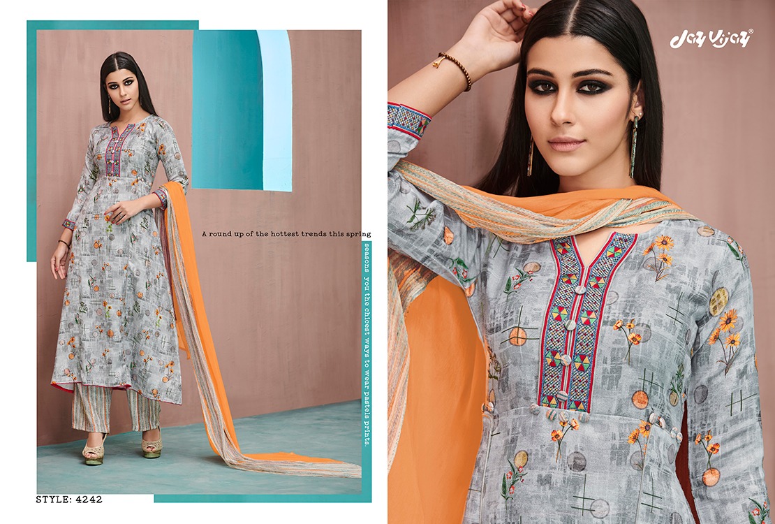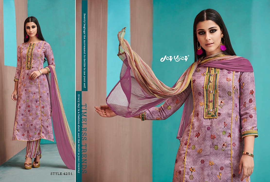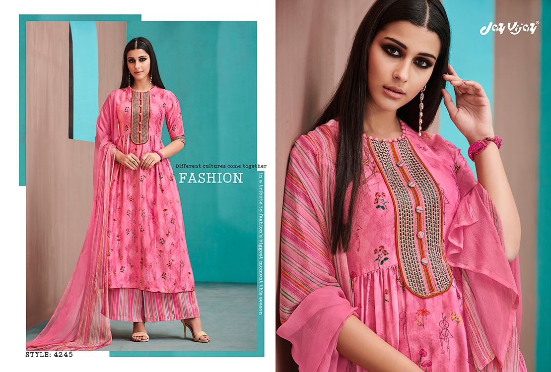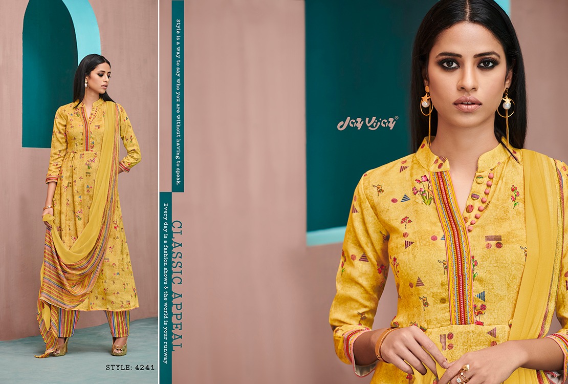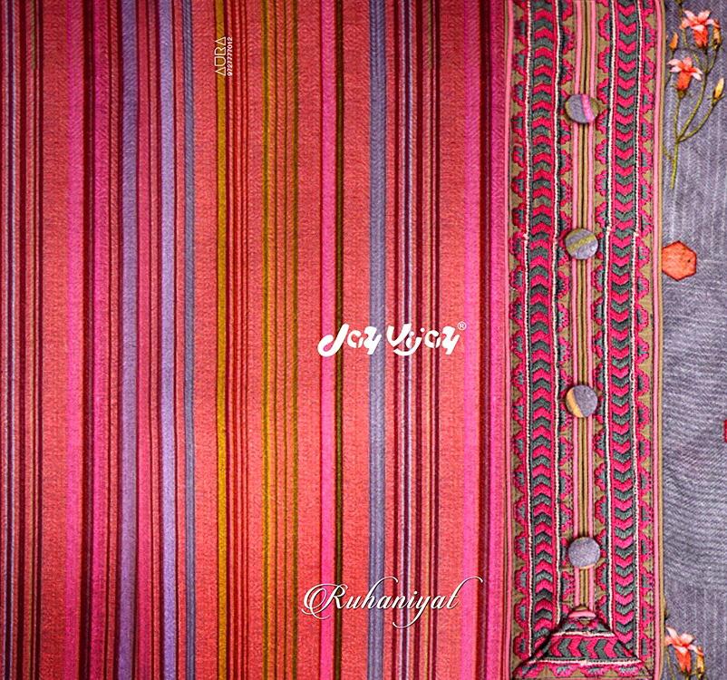 11 Design Singal Colour Of Jay Vijay . catlog Name - RUHANIYAT. By Jay Vijya . Series - 4241 to 4251 . Set to set. GST 5 Percent Extra Delivery from tomorrow Fabric Details Top=Pashmina Digital Print With Emb Work Bottom=Pashmina Digital Print Dupatta=Pure Chiffon Digital Print With Work |