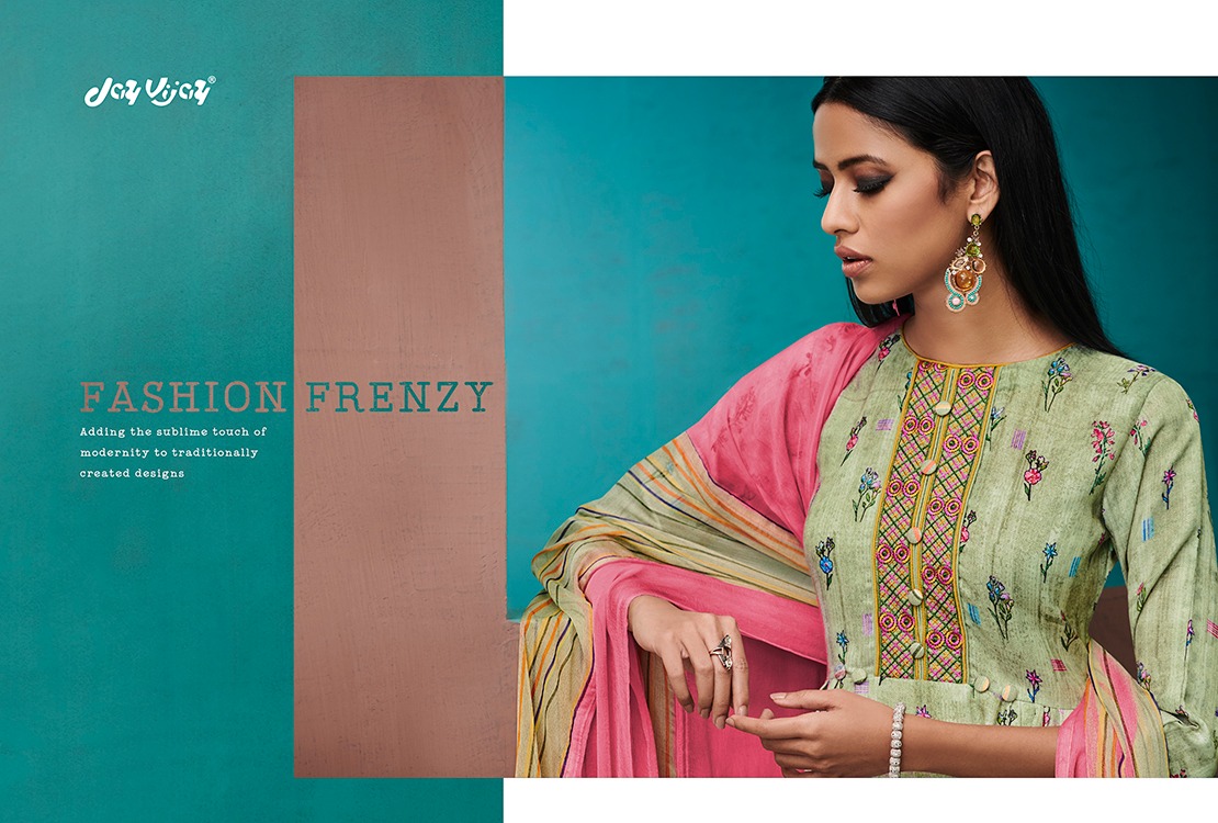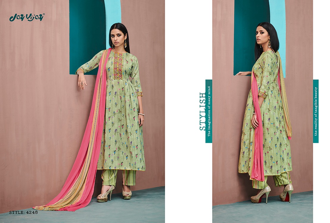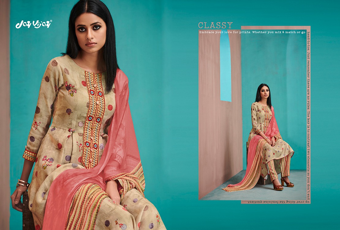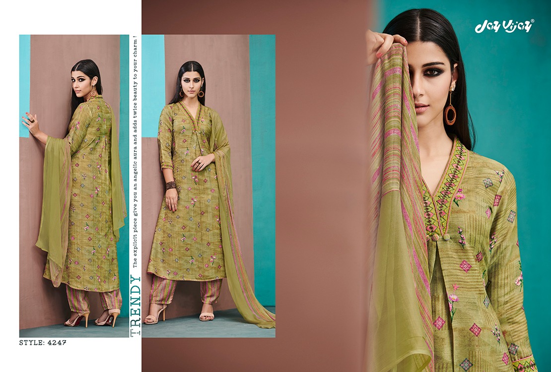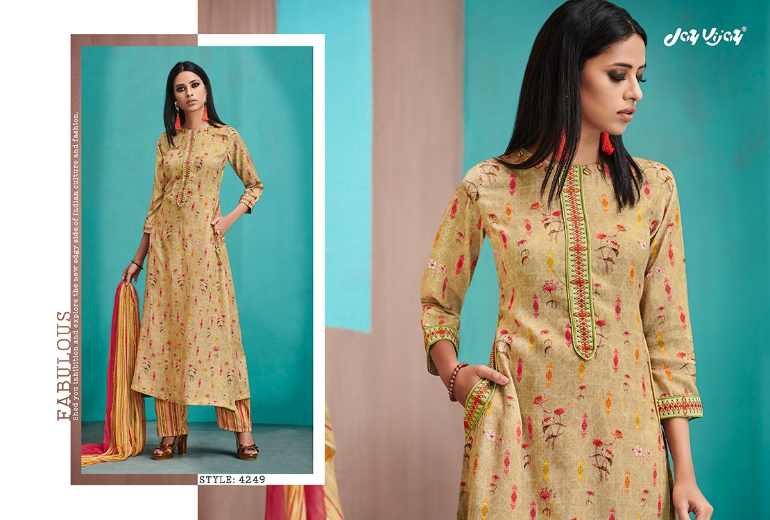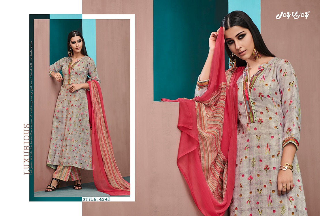 11 Design Singal Colour Of Jay Vijay . catlog Name - RUHANIYAT. By Jay Vijya . Series - 4241 to 4251 . Set to set. GST 5 Percent Extra Delivery from tomorrow Fabric Details Top=Pashmina Digital Print With Emb Work Bottom=Pashmina Digital Print Dupatta=Pure Chiffon Digital Print With Work |