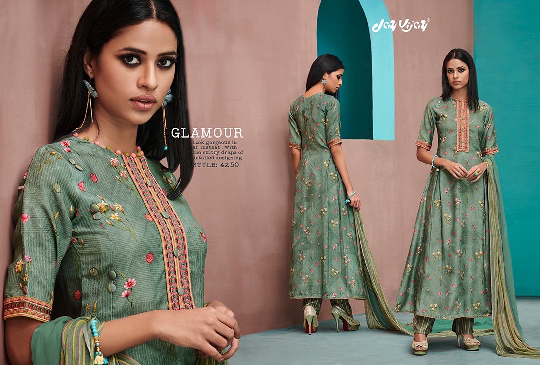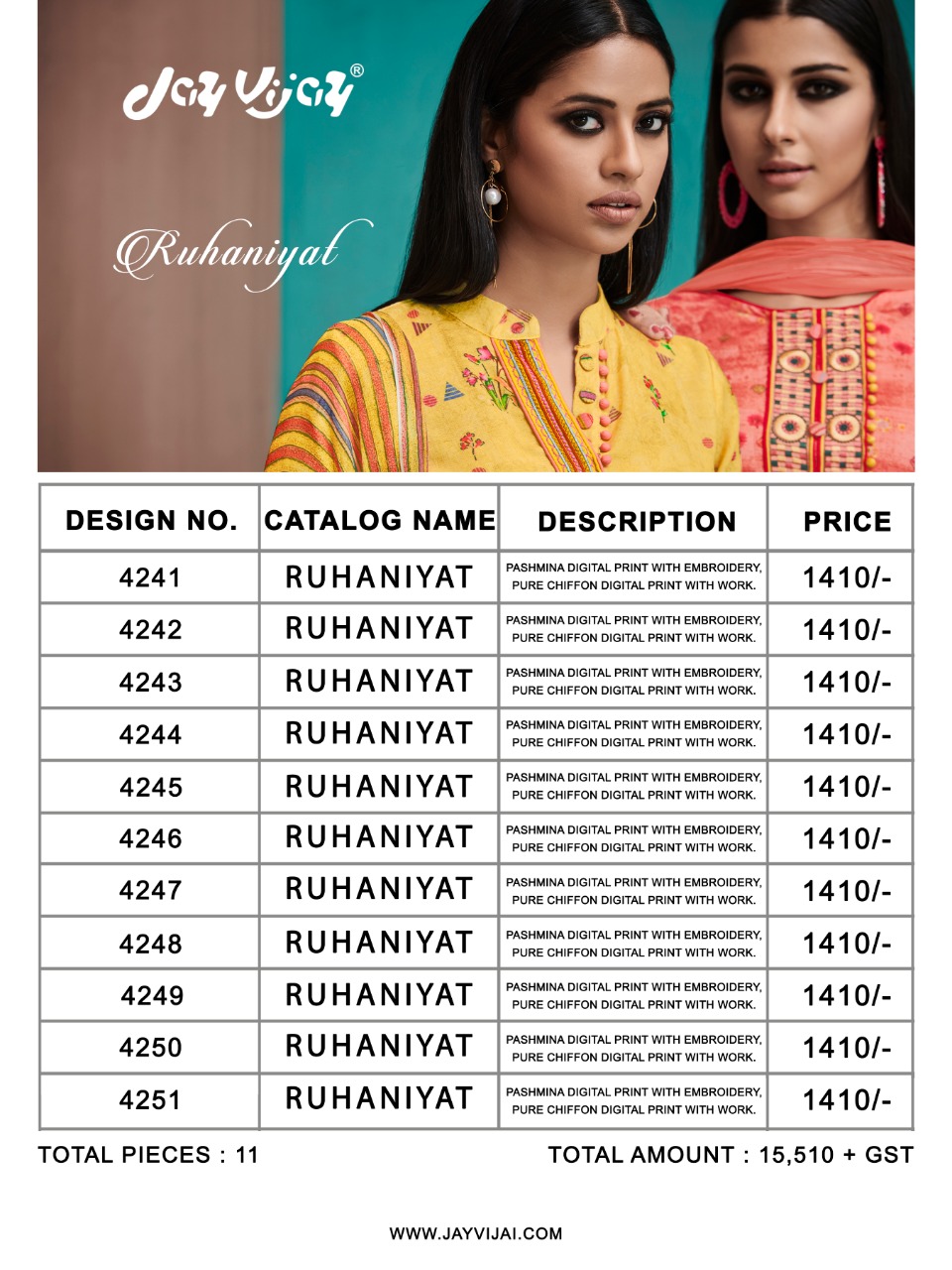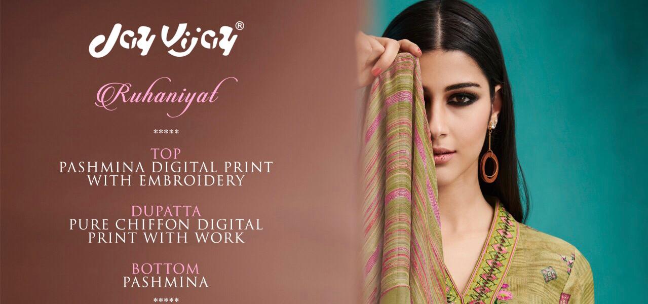 Buy Online Ruhaniyat By Jay Vijay 4241 To 4251 Series Designer Pashmina Digital Printed Salwar Kameez Catlog Wholesale Dealer Surat 11 Pcs of Full Catalogue at Wholesale Price. Looking for Ruhaniyat By Jay Vijay 4241 To 4251 Series Designer Pashmina Digital Printed Salwar Kameez Catlog Wholesale Dealer Surat Full Catalouge at Best Price? Buy Now Ruhaniyat By Jay Vijay 4241 To 4251 Series Designer Pashmina Digital Printed Salwar Kameez Catlog Wholesale Dealer Surat at Wholesale Rate of Rs 15510 with Total 11 Pcs from authroized dealer and supplier of JAY VIJAY Brand. Cost of Each piece is just only Rs 1410 which is very low and affordable price to resale the product in your retail store ,This is Surat based Wholesale Supplier & Dealer of JAY VIJAY Brand. Click on Brand name to Know more about JAY VIJAY Brand's products.Call or Whatsapp on 9898838984 for booking or enquiry