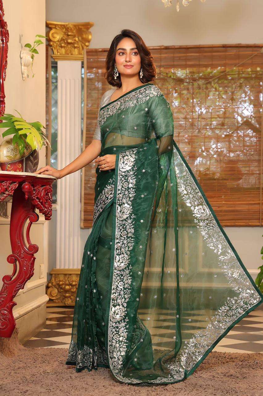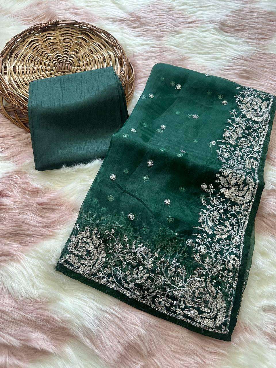 Specification ~ Type - sequence Embroidered ~ Print or Pattern Type - solid colors ~ Occasion - Traditional, Party, Wedding ~ Saree Fabric - Organza ~ Blouse Fabric - Silk Blend ~ Border - C pallu work ~ Blouse - Unstitched No of Colors -1