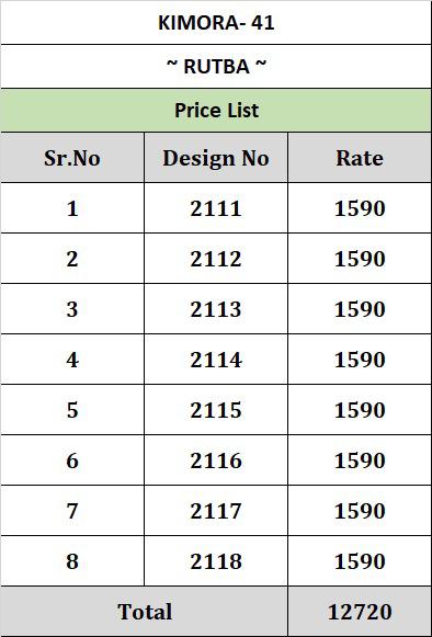 Buy Online Rutba By Kimora Designer Suits Collection 8 Pcs of Full Catalogue at Wholesale Price. Looking for Rutba By Kimora Designer Suits Collection Full Catalouge at Best Price? Buy Now Rutba By Kimora Designer Suits Collection at Wholesale Rate of Rs 12720 with Total 8 Pcs from authroized dealer and supplier of KIMORA Brand. Cost of Each piece is just only Rs 1590 which is very low and affordable price to resale the product in your retail store ,This is Surat based Wholesale Supplier & Dealer of KIMORA Brand. Click on Brand name to Know more about KIMORA Brand's products.Call or Whatsapp on 9898838984 for booking or enquiry