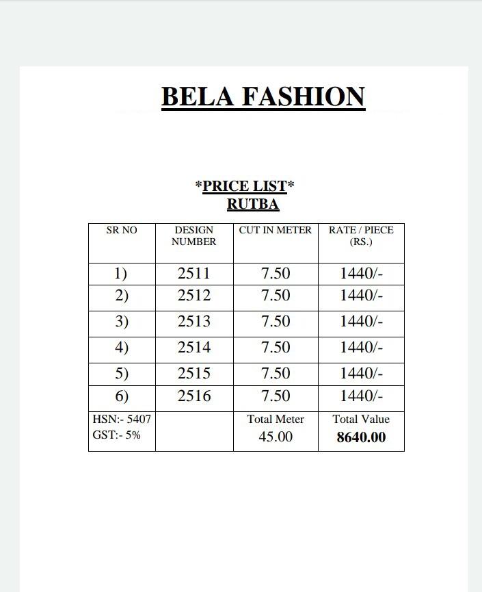 Buy Online Rutba Series 2511 To 2516 By Bela Single Available Manufacturer Traders Surat 6 Pcs of Full Catalogue at Wholesale Price. Looking for Rutba Series 2511 To 2516 By Bela Single Available Manufacturer Traders Surat Full Catalouge at Best Price? Buy Now Rutba Series 2511 To 2516 By Bela Single Available Manufacturer Traders Surat at Wholesale Rate of Rs 8640 with Total 6 Pcs from authroized dealer and supplier of BELA Brand. Cost of Each piece is just only Rs 1440 which is very low and affordable price to resale the product in your retail store ,This is Surat based Wholesale Supplier & Dealer of BELA Brand. Click on Brand name to Know more about BELA Brand's products.Call or Whatsapp on 9898838984 for booking or enquiry