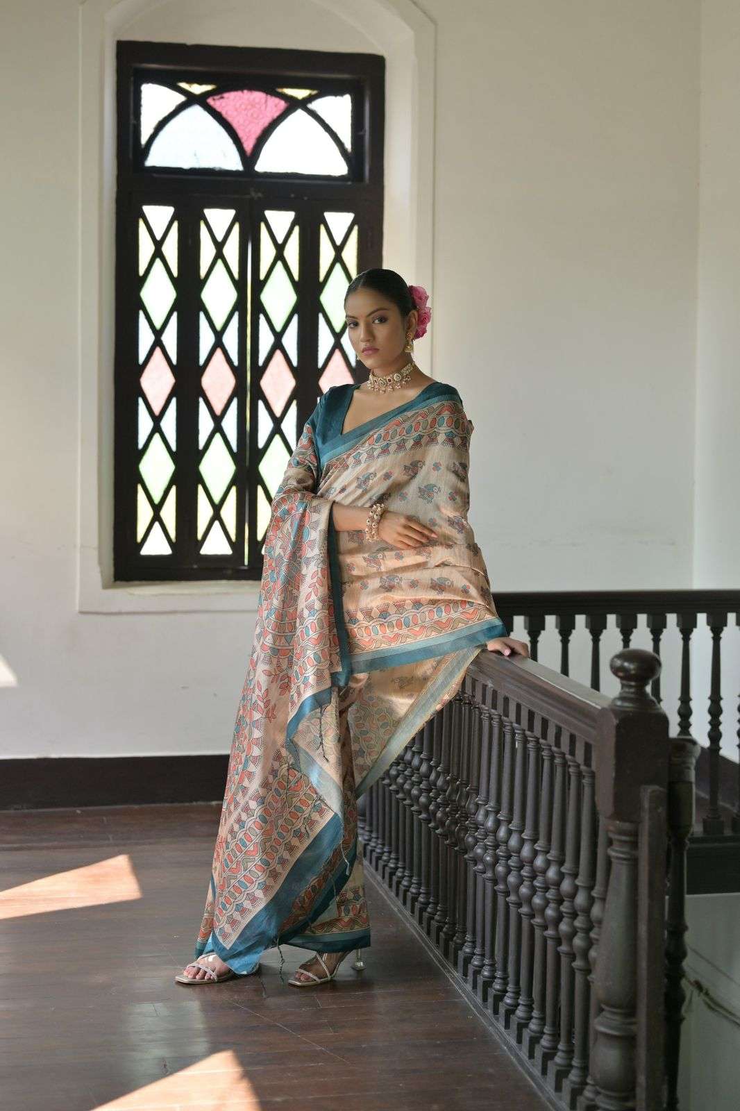 Introducing Rutrang🌹 Aarushi Madhubani 2, a graceful Soft Tussar Silk saree adorned with exquisite Madhubani prints that celebrate traditional Indian art. The saree features a beautifully printed traditional pallu, enhanced with fancy tassels for a stylish finish. Paired with a contrast blouse piece, this saree perfectly blends heritage charm with modern elegance. Ideal for festive occasions, cultural events, and elegant day wear. ✔️ Fabric: Soft Tussar Silk |