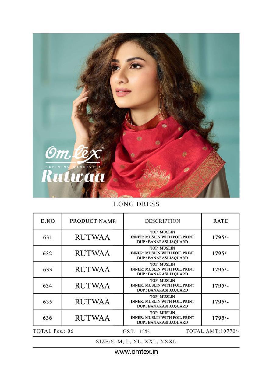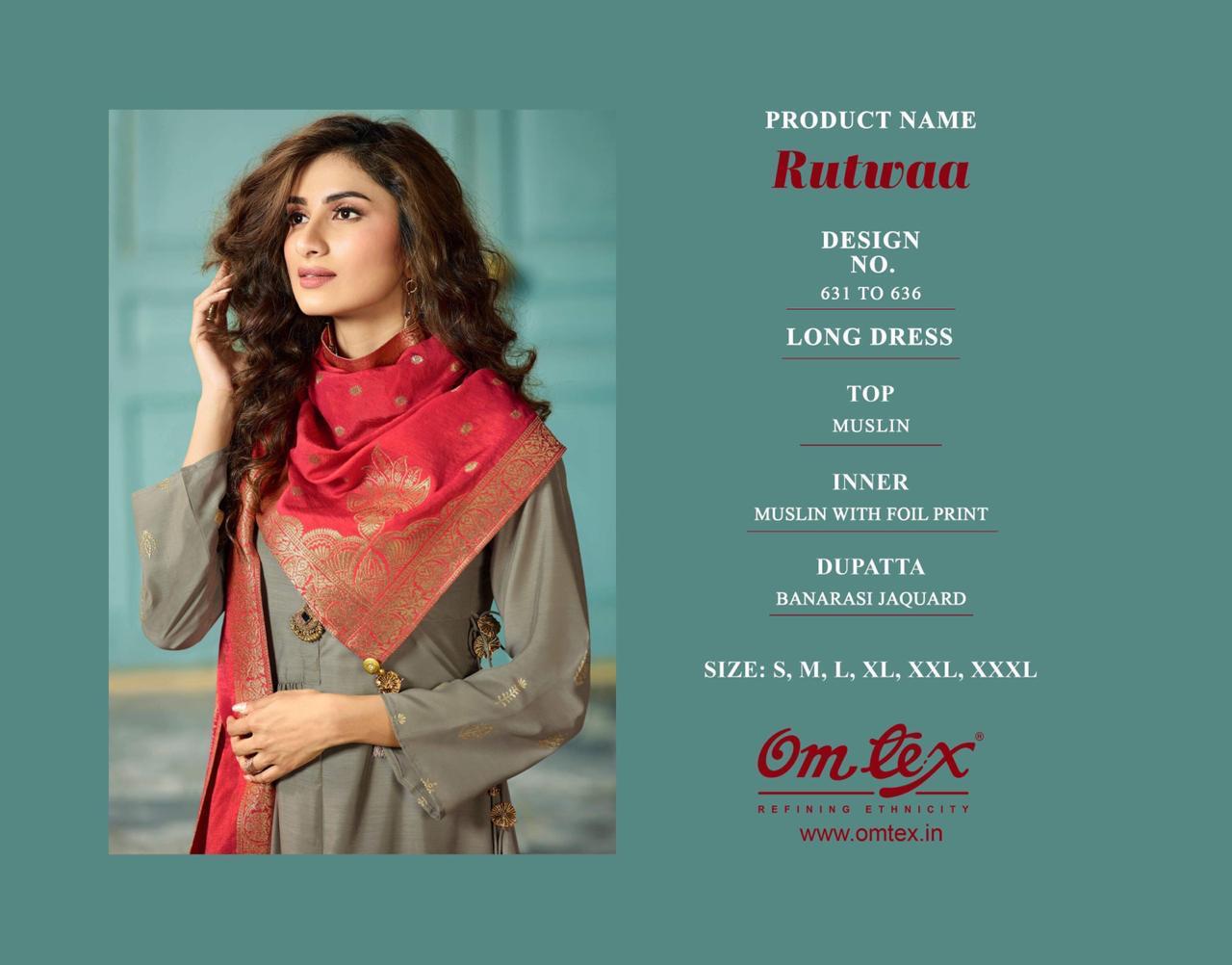 Buy Online Rutwa By Omtex Series 631 To 636 Pure Masline Long Designer Ready To Wear Suits Wholesale Supplier Gujarat 6 Pcs of Full Catalogue at Wholesale Price. Looking for Rutwa By Omtex Series 631 To 636 Pure Masline Long Designer Ready To Wear Suits Wholesale Supplier Gujarat Full Catalouge at Best Price? Buy Now Rutwa By Omtex Series 631 To 636 Pure Masline Long Designer Ready To Wear Suits Wholesale Supplier Gujarat at Wholesale Rate of Rs 10770 with Total 6 Pcs from authroized dealer and supplier of OM TEX Brand. Cost of Each piece is just only Rs 1795 which is very low and affordable price to resale the product in your retail store ,This is Surat based Wholesale Supplier & Dealer of OM TEX Brand. Click on Brand name to Know more about OM TEX Brand's products.Call or Whatsapp on 9898838984 for booking or enquiry