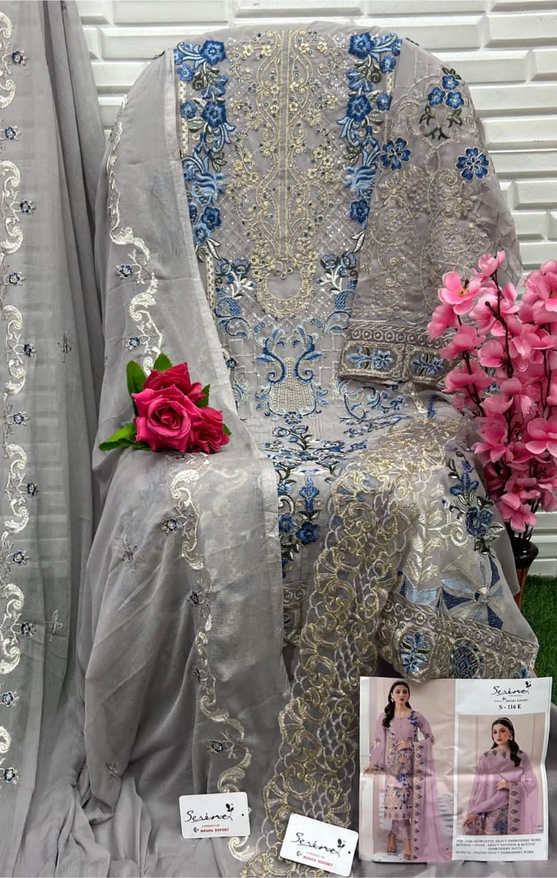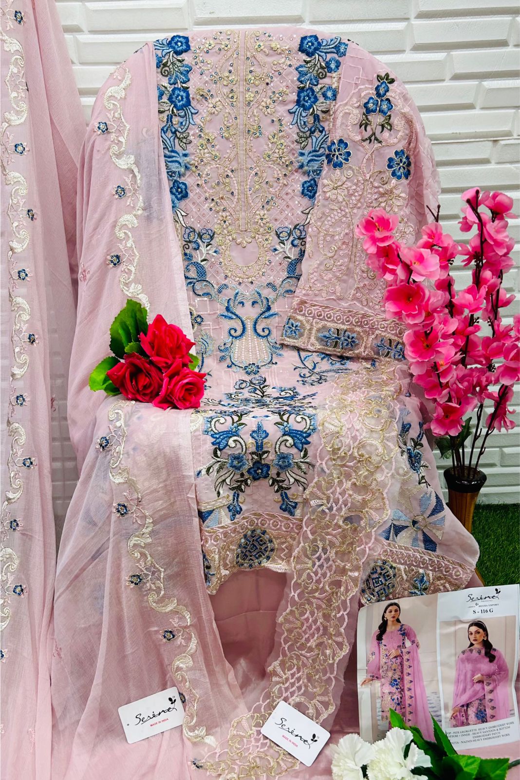_*BRAND NAME*_:- SERINE®? _*D NO*_:- S-116 E TO H _*Top*_:- FOX GEORGETTE HEAVY EMBROIDERED WITH DAIMOND, PEARLS AND ACCESSORIES _*Dupatta*_:- NAZNEEN HEAVY EMBROIDERED _*Bottom*_:- SANTOON WITH EMB PATCH _*Inner*_:- SANTOON _* RATE*_:- 1199? GST SHIP EXTRA _*4 PCS IN SET *_ _*READY TO SHIP*_ _*MEGHA EXPORT*_ 100+Singles |