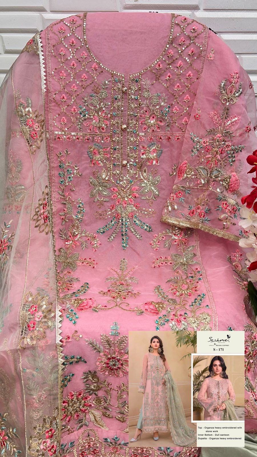 Buy Online S 171 By Serine Organza Embroidery Pakistani Suits 5 Pcs of Full Catalogue at Wholesale Price. Looking for S 171 By Serine Organza Embroidery Pakistani Suits Full Catalouge at Best Price? Buy Now S 171 By Serine Organza Embroidery Pakistani Suits at Wholesale Rate of Rs 6745 with Total 5 Pcs from authroized dealer and supplier of Brand. Cost of Each piece is just only Rs 1349 which is very low and affordable price to resale the product in your retail store ,This is Surat based Wholesale Supplier & Dealer of Brand. Click on Brand name to Know more about Brand's products.Call or Whatsapp on 9898838984 for booking or enquiry