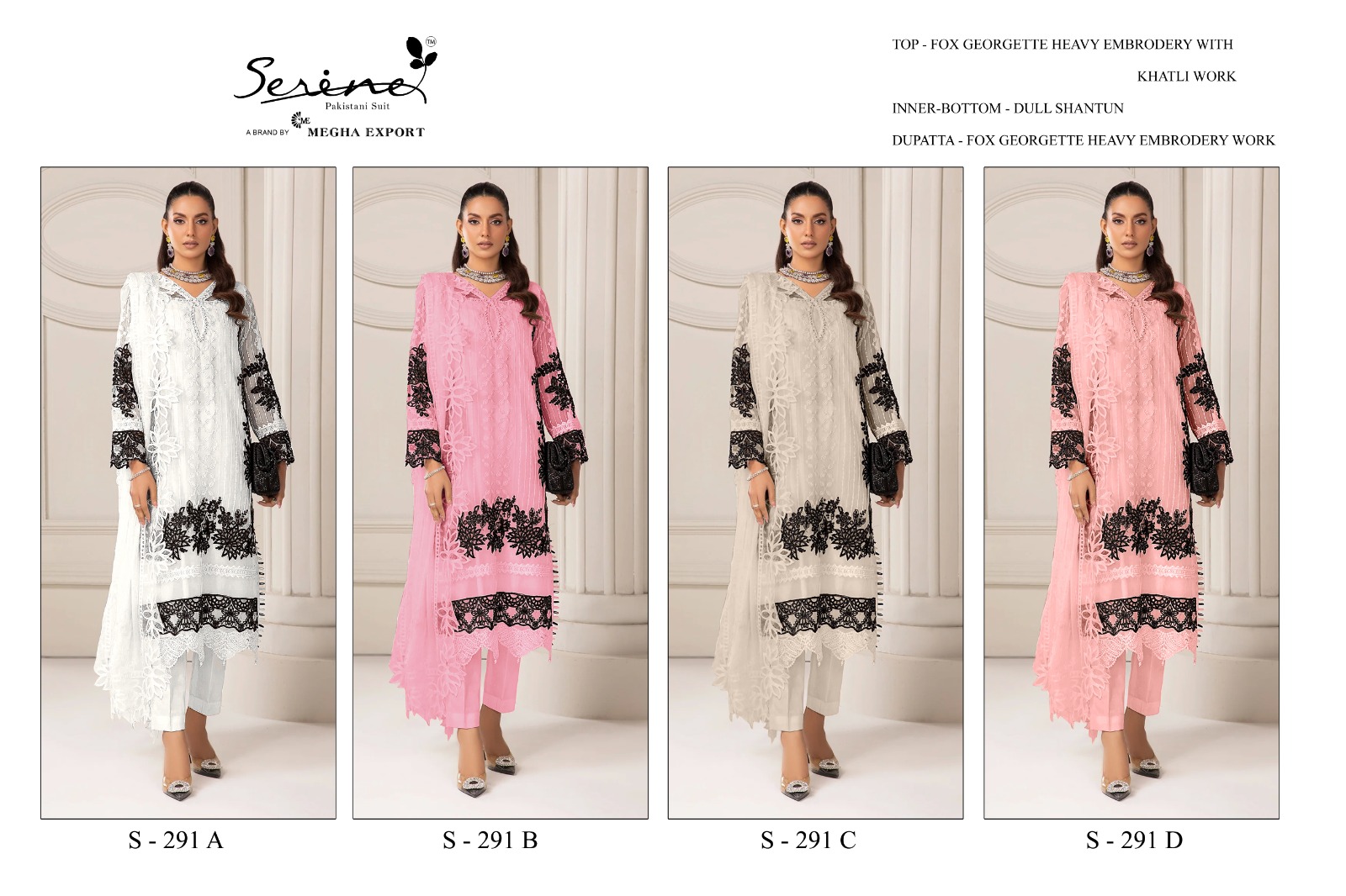 Buy Online S 291 By Serine Pakistani Collection 4 Pcs of Full Catalogue at Wholesale Price. Looking for S 291 By Serine Pakistani Collection Full Catalouge at Best Price? Buy Now S 291 By Serine Pakistani Collection at Wholesale Rate of Rs 5196 with Total 4 Pcs from authroized dealer and supplier of Brand. Cost of Each piece is just only Rs 1299 which is very low and affordable price to resale the product in your retail store ,This is Surat based Wholesale Supplier & Dealer of Brand. Click on Brand name to Know more about Brand's products.Call or Whatsapp on 9898838984 for booking or enquiry