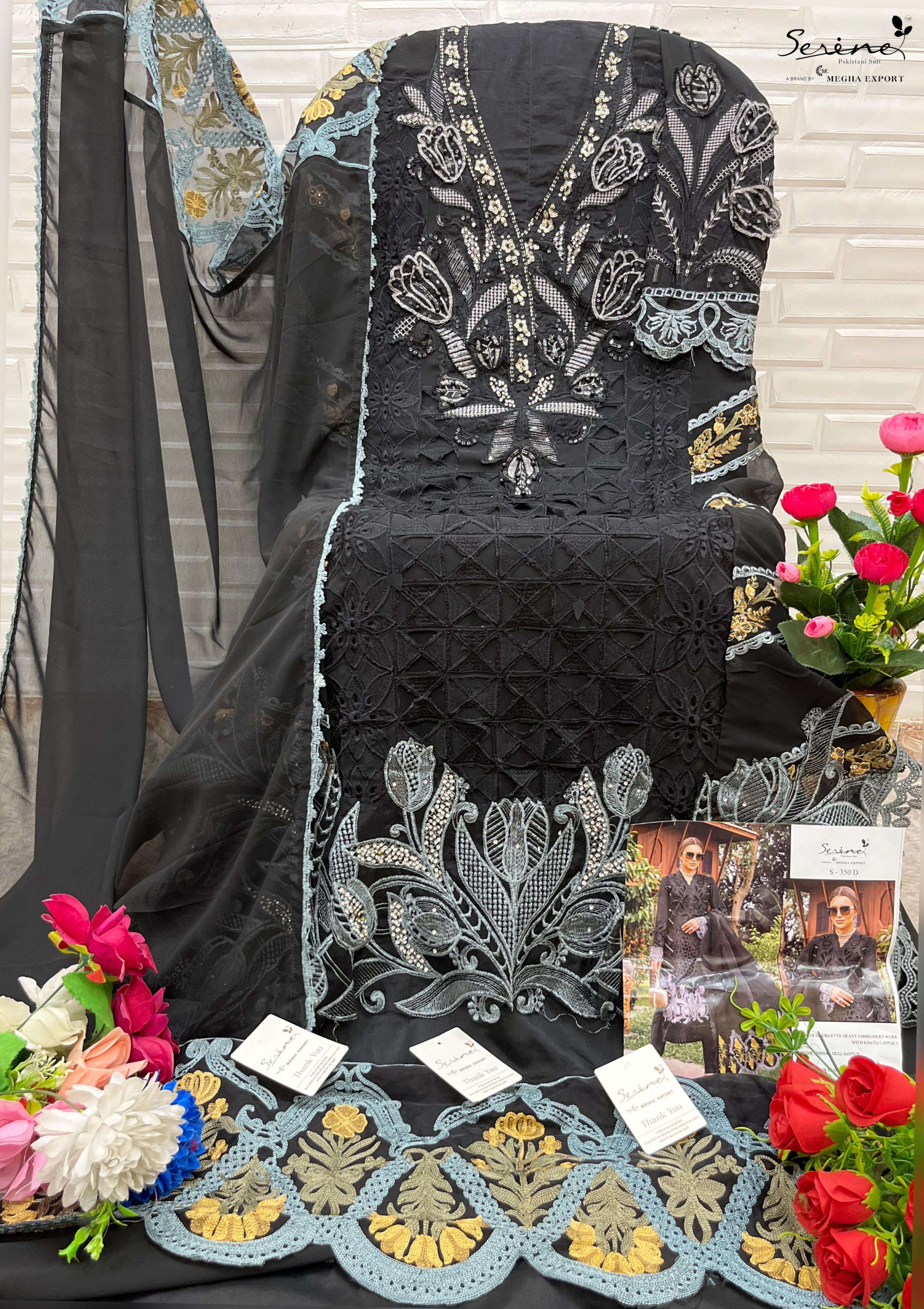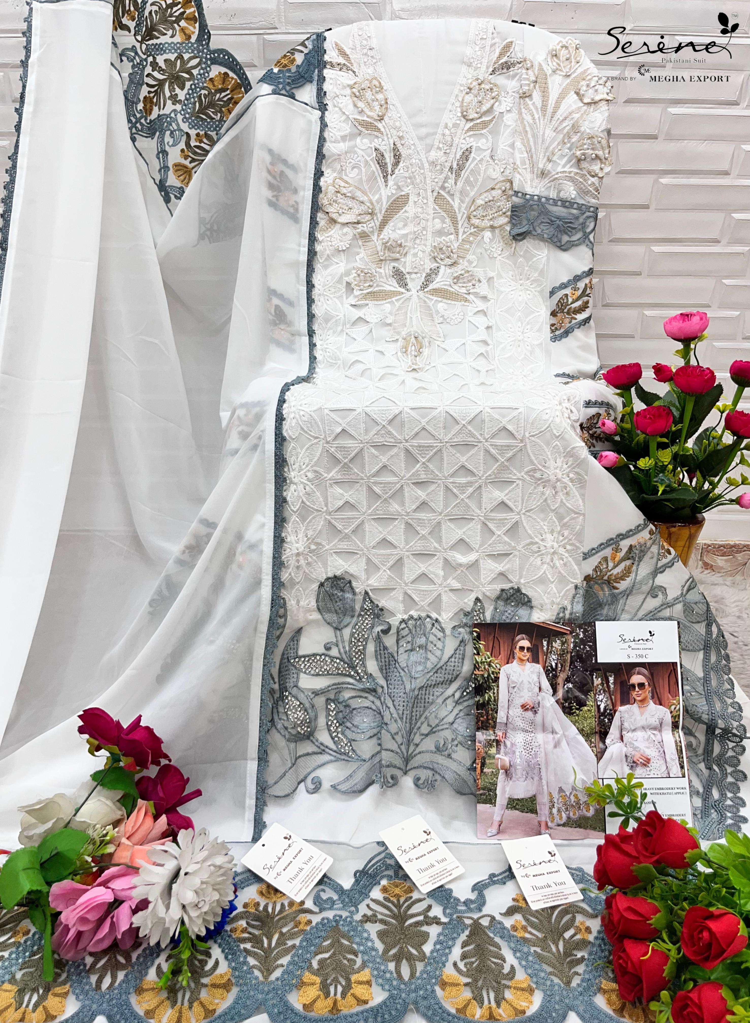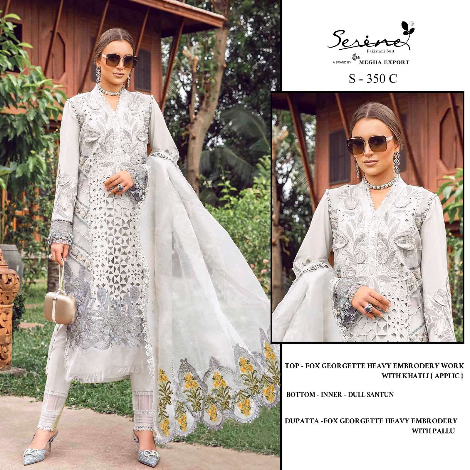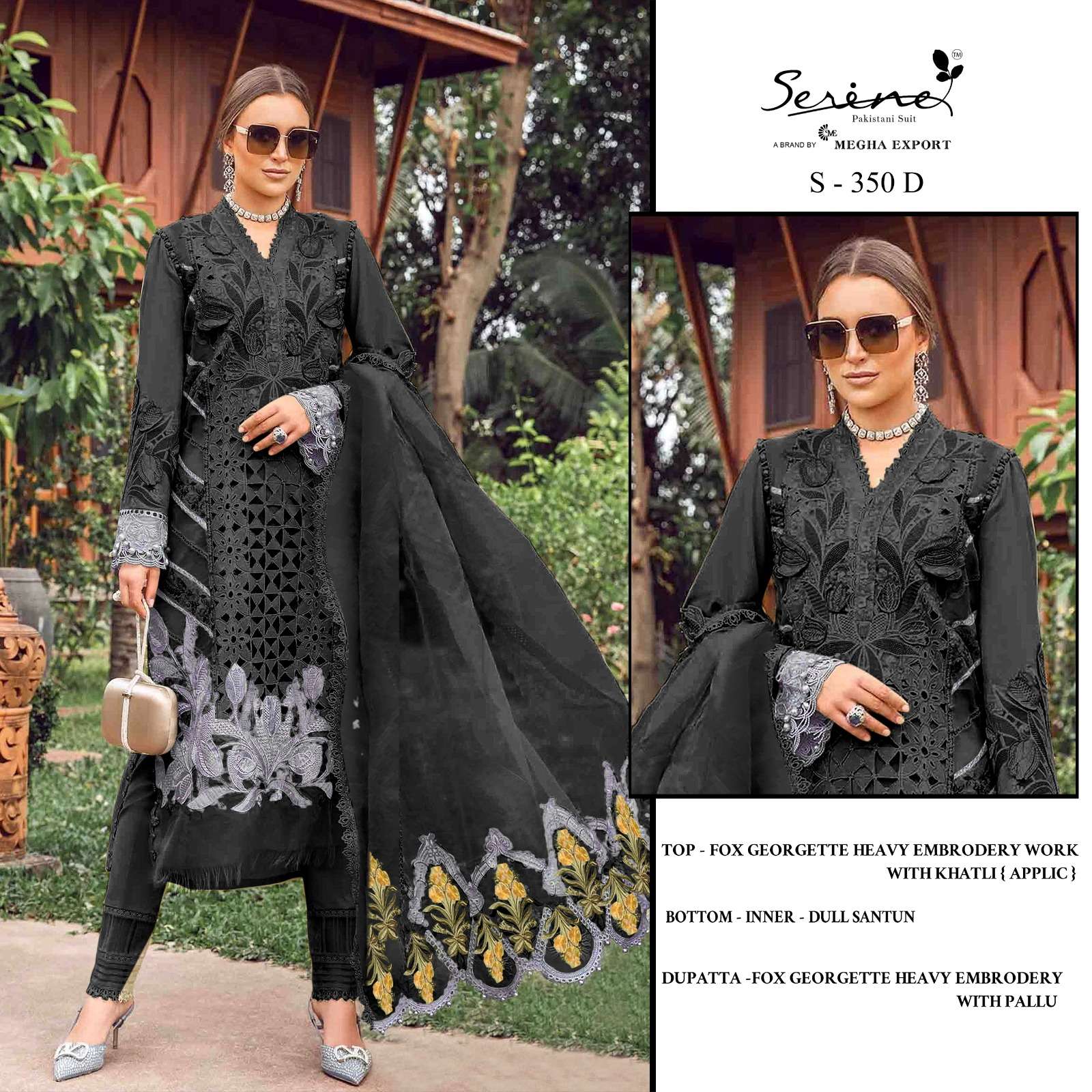 BRAND NAME:- SERINE® D NO:- S-350 Top:- FOX GEORGETTE HEAVY EMBROIDERED WITH HANDWORK {APPLIC} BOTTOM.INNR*dull DUPATTA:- FOX GEORGETTE EMBROIDERED