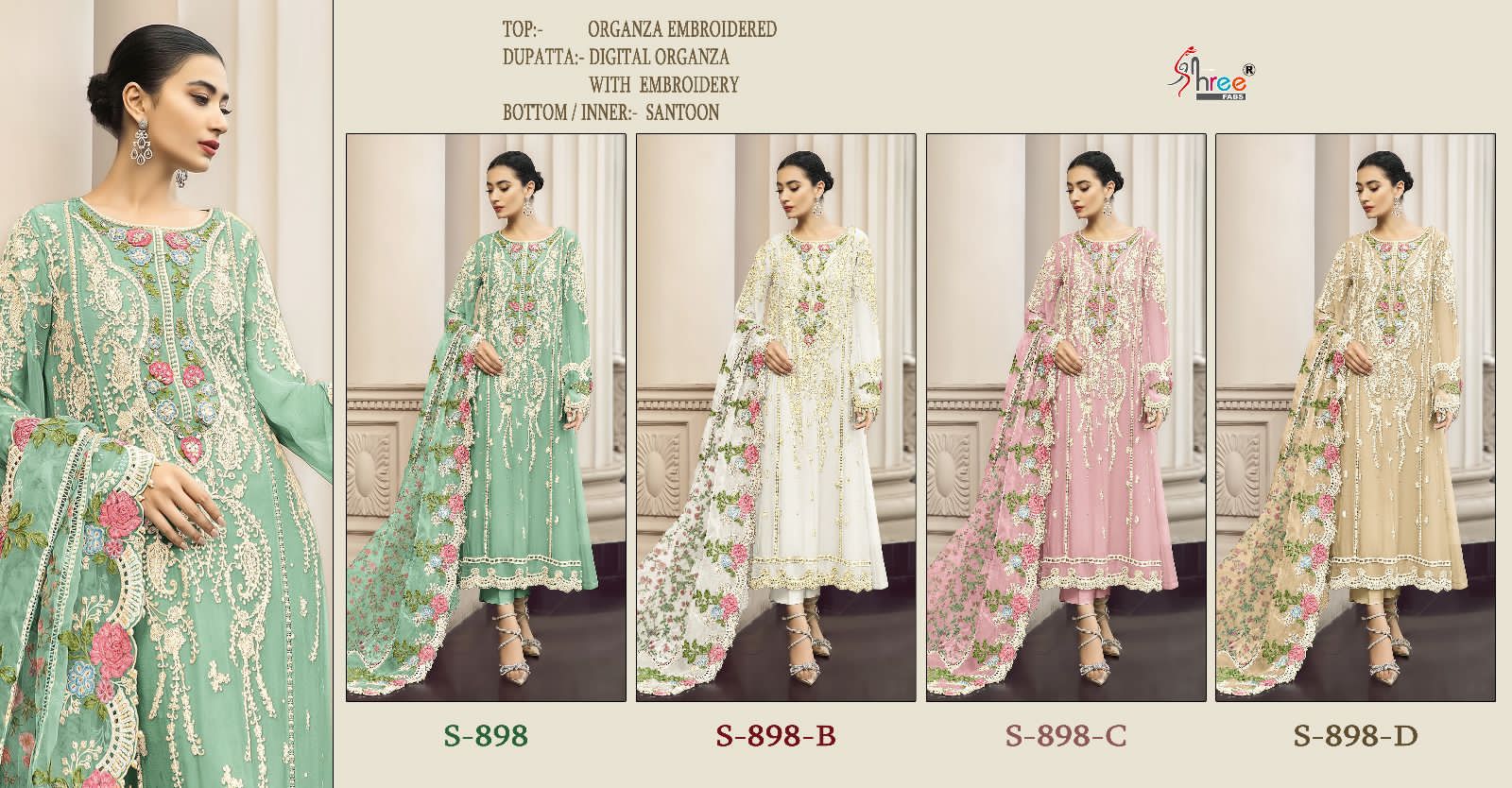 Buy Online S 898 By Shree Fabs Organza Pakistani Concept Single Avilable Wholesaler Supplier Surat 4 Pcs of Full Catalogue at Wholesale Price. Looking for S 898 By Shree Fabs Organza Pakistani Concept Single Avilable Wholesaler Supplier Surat Full Catalouge at Best Price? Buy Now S 898 By Shree Fabs Organza Pakistani Concept Single Avilable Wholesaler Supplier Surat at Wholesale Rate of Rs 4800 with Total 4 Pcs from authroized dealer and supplier of SHREE FABS Brand. Cost of Each piece is just only Rs 1200 which is very low and affordable price to resale the product in your retail store ,This is Surat based Wholesale Supplier & Dealer of SHREE FABS Brand. Click on Brand name to Know more about SHREE FABS Brand's products.Call or Whatsapp on 9898838984 for booking or enquiry