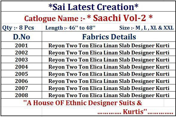 Buy Online Saachi Vol 2 By Slc Sai Latest Creation 2001 Series Fancy Reyon Kurti Catlog Wholesaler Surat 8 Pcs of Full Catalogue at Wholesale Price. Looking for Saachi Vol 2 By Slc Sai Latest Creation 2001 Series Fancy Reyon Kurti Catlog Wholesaler Surat Full Catalouge at Best Price? Buy Now Saachi Vol 2 By Slc Sai Latest Creation 2001 Series Fancy Reyon Kurti Catlog Wholesaler Surat at Wholesale Rate of Rs 4408 with Total 8 Pcs from authroized dealer and supplier of Brand. Cost of Each piece is just only Rs 551 which is very low and affordable price to resale the product in your retail store ,This is Surat based Wholesale Supplier & Dealer of Brand. Click on Brand name to Know more about Brand's products.Call or Whatsapp on 9898838984 for booking or enquiry