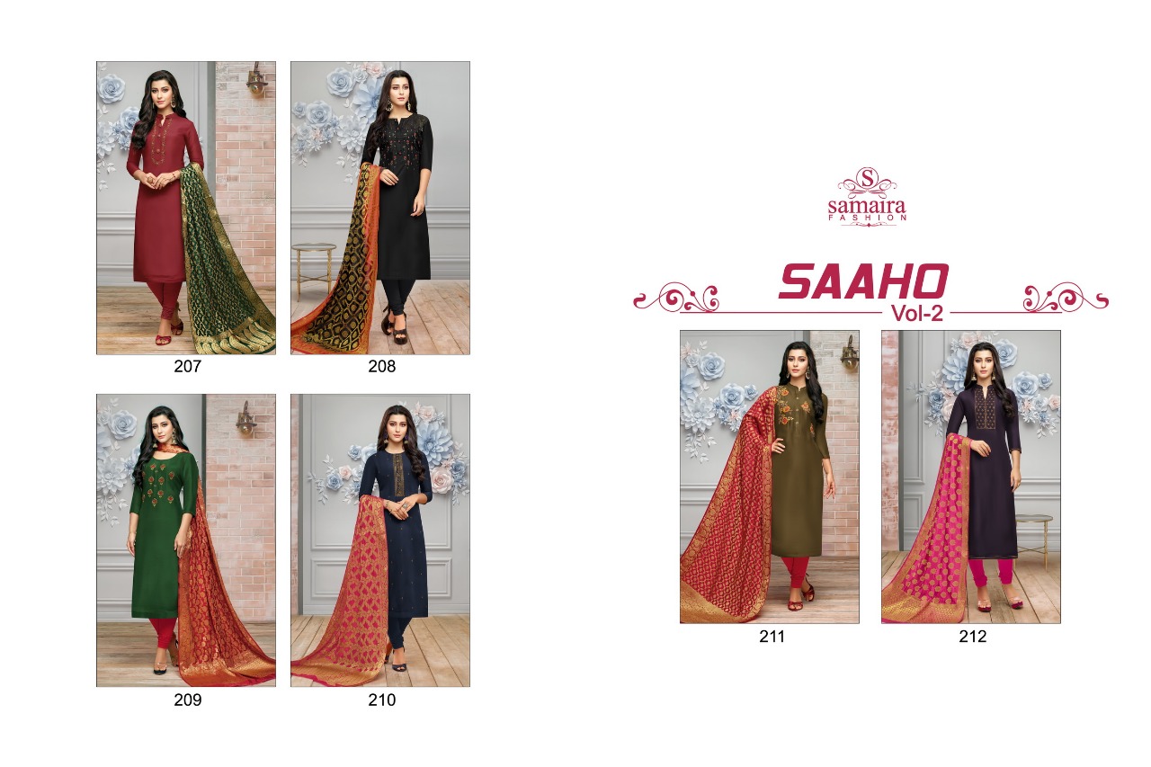 Buy Online Saaho Vol 2 By Samaira Fashion Silk Embroidered Work Suits Wholesale Supplier India 6 Pcs of Full Catalogue at Wholesale Price. Looking for Saaho Vol 2 By Samaira Fashion Silk Embroidered Work Suits Wholesale Supplier India Full Catalouge at Best Price? Buy Now Saaho Vol 2 By Samaira Fashion Silk Embroidered Work Suits Wholesale Supplier India at Wholesale Rate of Rs 5100 with Total 6 Pcs from authroized dealer and supplier of Samaira Fashion Brand. Cost of Each piece is just only Rs 850 which is very low and affordable price to resale the product in your retail store ,This is Surat based Wholesale Supplier & Dealer of Samaira Fashion Brand. Click on Brand name to Know more about Samaira Fashion Brand's products.Call or Whatsapp on 9898838984 for booking or enquiry