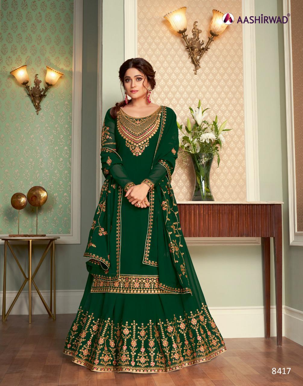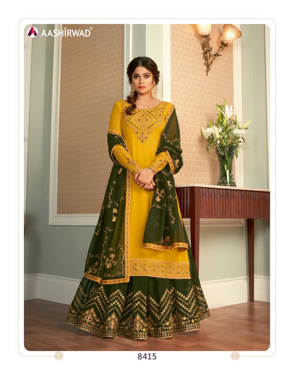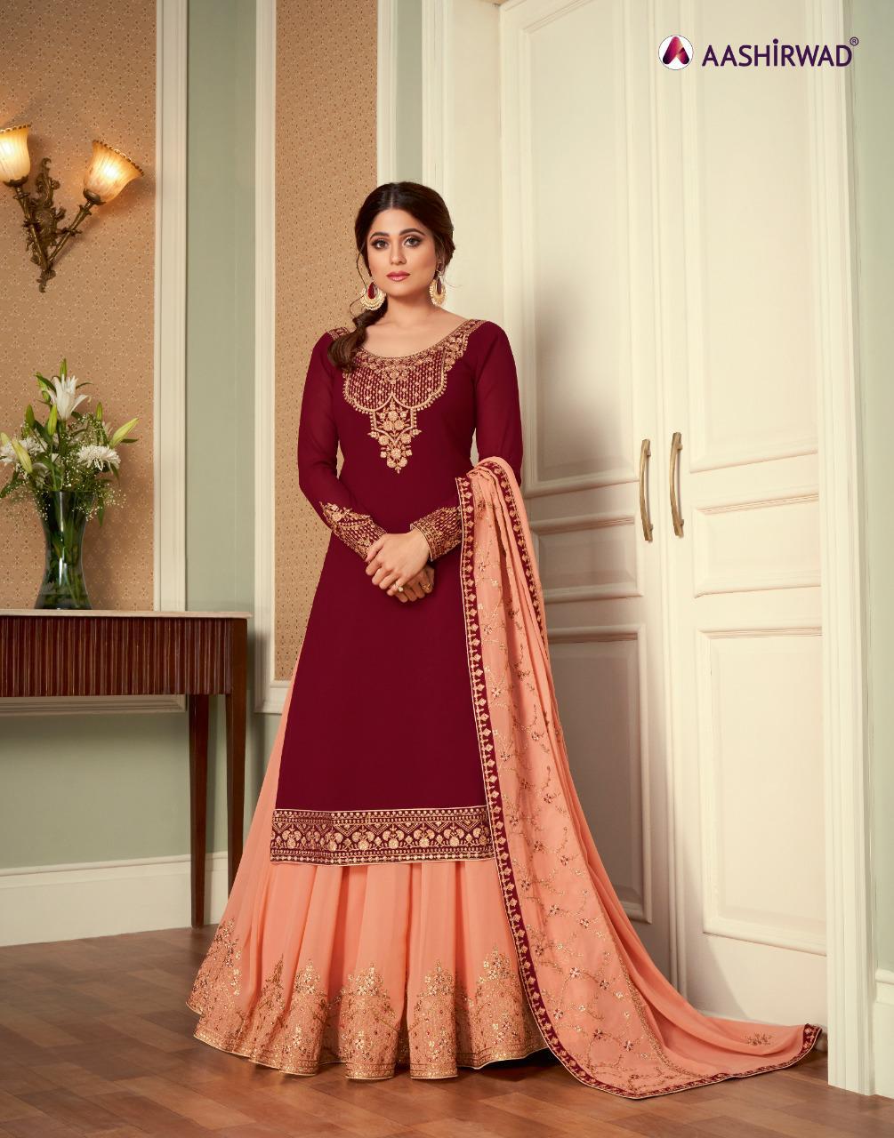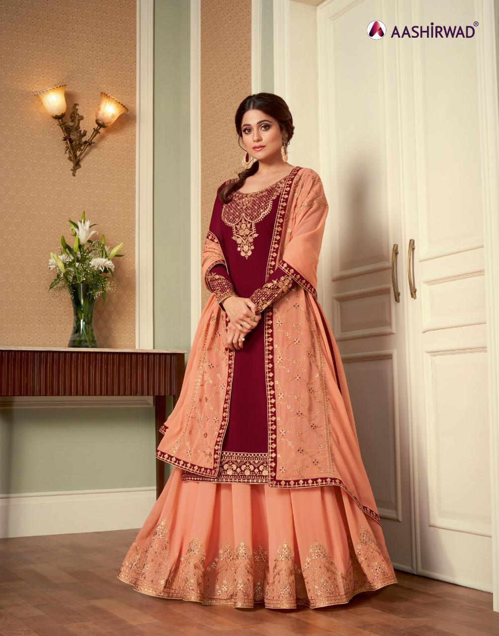 AASHIRWAD SAARA (5 pcs ) Top - Real georgette Inner - Dull Santoon Skirt -Real georgette front n back Emb. (Free size stitch ) Price - 2695 per Pcs. * GST 12 Percent Extra * * set & loose & singel * HSN CODE - 630790 Dispatching in 3 days !!!! 100+single |