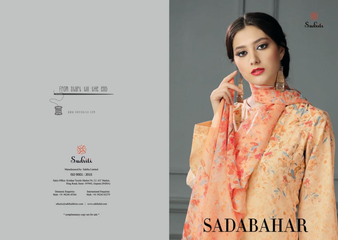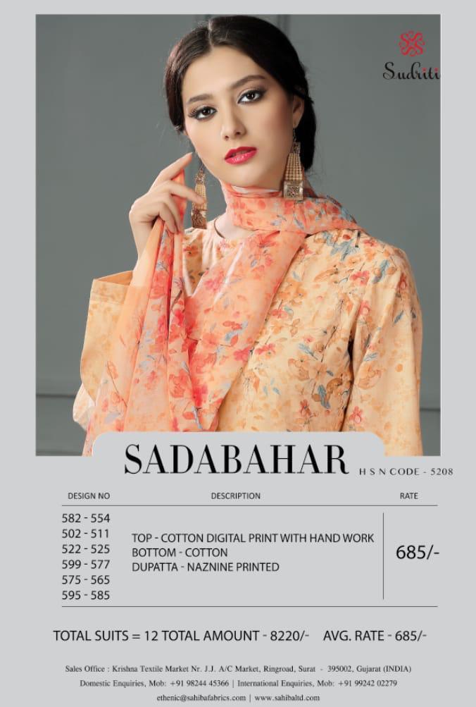 Buy Online Sadabahar By Sahiba Sudriti Cottan Digital Print With Hand Work Suit 12 Pcs of Full Catalogue at Wholesale Price. Looking for Sadabahar By Sahiba Sudriti Cottan Digital Print With Hand Work Suit Full Catalouge at Best Price? Buy Now Sadabahar By Sahiba Sudriti Cottan Digital Print With Hand Work Suit at Wholesale Rate of Rs 8220 with Total 12 Pcs from authroized dealer and supplier of Brand. Cost of Each piece is just only Rs 685 which is very low and affordable price to resale the product in your retail store ,This is Surat based Wholesale Supplier & Dealer of Brand. Click on Brand name to Know more about Brand's products.Call or Whatsapp on 9898838984 for booking or enquiry