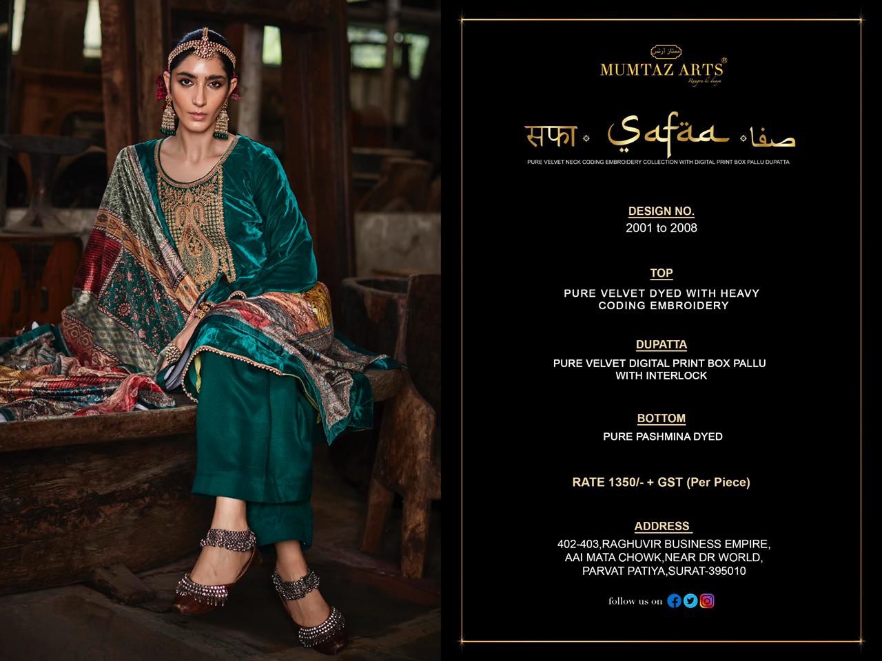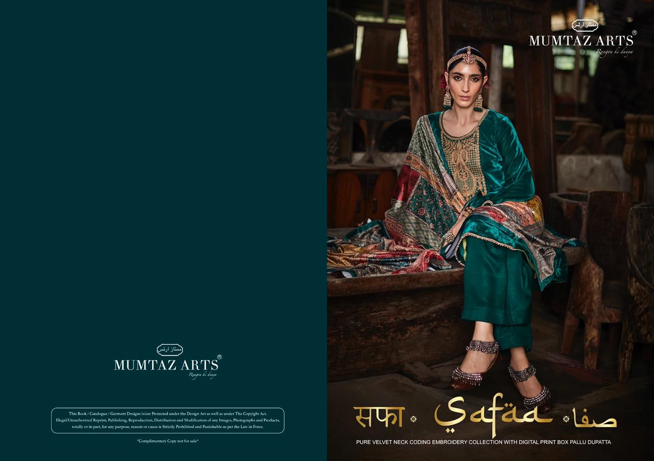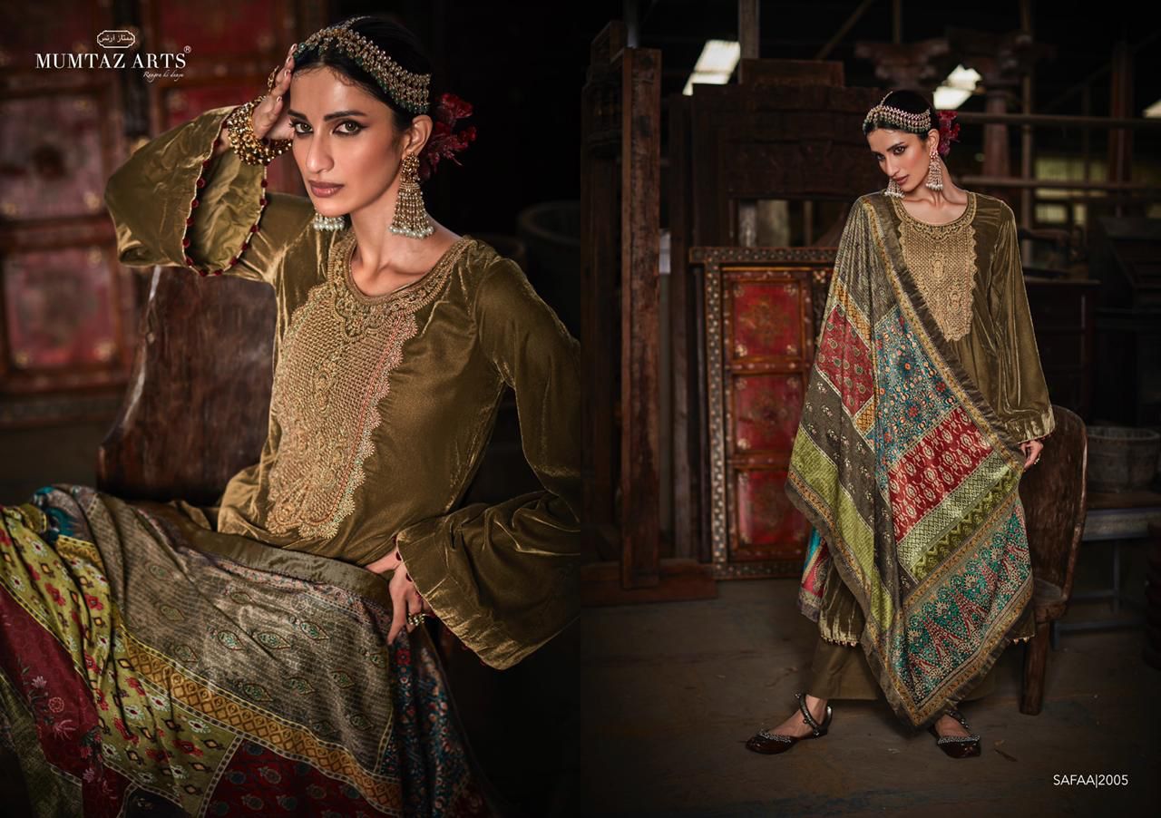Buy Online Safaa Velvet By Mumtaz Arts Dealer And Exporter Surat Gujarat 8 Pcs of Full Catalogue at Wholesale Price. Looking for Safaa Velvet By Mumtaz Arts Dealer And Exporter Surat Gujarat Full Catalouge at Best Price? Buy Now Safaa Velvet By Mumtaz Arts Dealer And Exporter Surat Gujarat at Wholesale Rate of Rs 10800 with Total 8 Pcs from authroized dealer and supplier of MUMTAZ ARTS Brand. Cost of Each piece is just only Rs 1350 which is very low and affordable price to resale the product in your retail store ,This is Surat based Wholesale Supplier & Dealer of MUMTAZ ARTS Brand. Click on Brand name to Know more about MUMTAZ ARTS Brand's products.Call or Whatsapp on 9898838984 for booking or enquiry