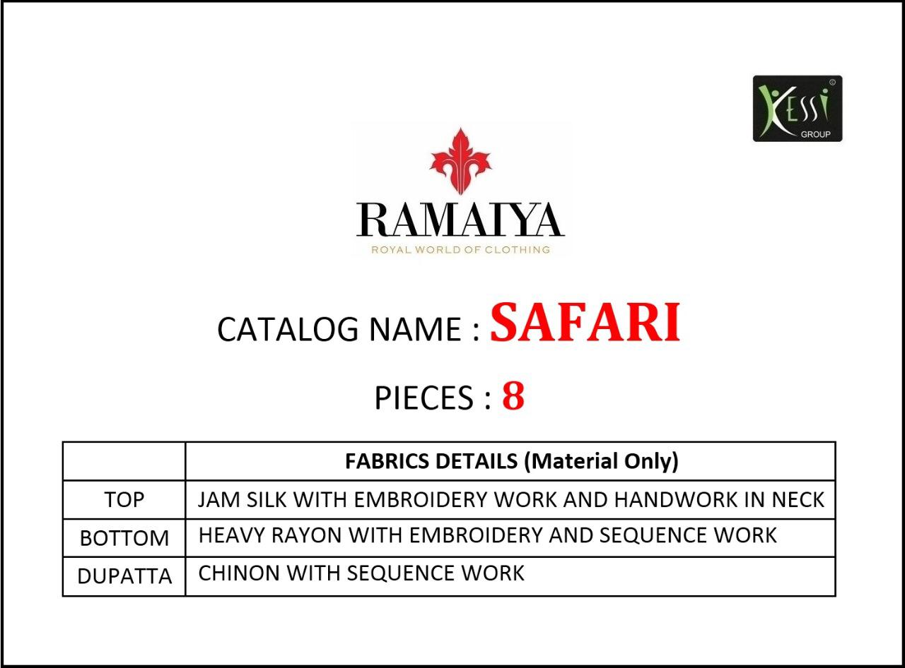 Buy Online Safari By Kessi Ramaiya Jam Silk Dress Matarials Wholesale Supplier Surat 8 Pcs of Full Catalogue at Wholesale Price. Looking for Safari By Kessi Ramaiya Jam Silk Dress Matarials Wholesale Supplier Surat Full Catalouge at Best Price? Buy Now Safari By Kessi Ramaiya Jam Silk Dress Matarials Wholesale Supplier Surat at Wholesale Rate of Rs 7192 with Total 8 Pcs from authroized dealer and supplier of KESSI Brand. Cost of Each piece is just only Rs 899 which is very low and affordable price to resale the product in your retail store ,This is Surat based Wholesale Supplier & Dealer of KESSI Brand. Click on Brand name to Know more about KESSI Brand's products.Call or Whatsapp on 9898838984 for booking or enquiry