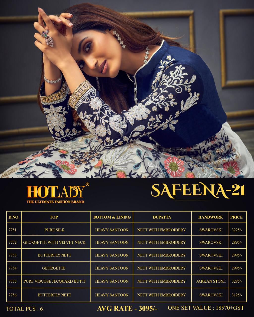 Buy Online Safeena Vol 21 Series 7751 To 7756 By Hotlady Single And Set Stockiest And Supplier From Surat 6 Pcs of Full Catalogue at Wholesale Price. Looking for Safeena Vol 21 Series 7751 To 7756 By Hotlady Single And Set Stockiest And Supplier From Surat Full Catalouge at Best Price? Buy Now Safeena Vol 21 Series 7751 To 7756 By Hotlady Single And Set Stockiest And Supplier From Surat at Wholesale Rate of Rs 18570 with Total 6 Pcs from authroized dealer and supplier of HOTLADY Brand. Cost of Each piece is just only Rs 3095 which is very low and affordable price to resale the product in your retail store ,This is Surat based Wholesale Supplier & Dealer of HOTLADY Brand. Click on Brand name to Know more about HOTLADY Brand's products.Call or Whatsapp on 9898838984 for booking or enquiry