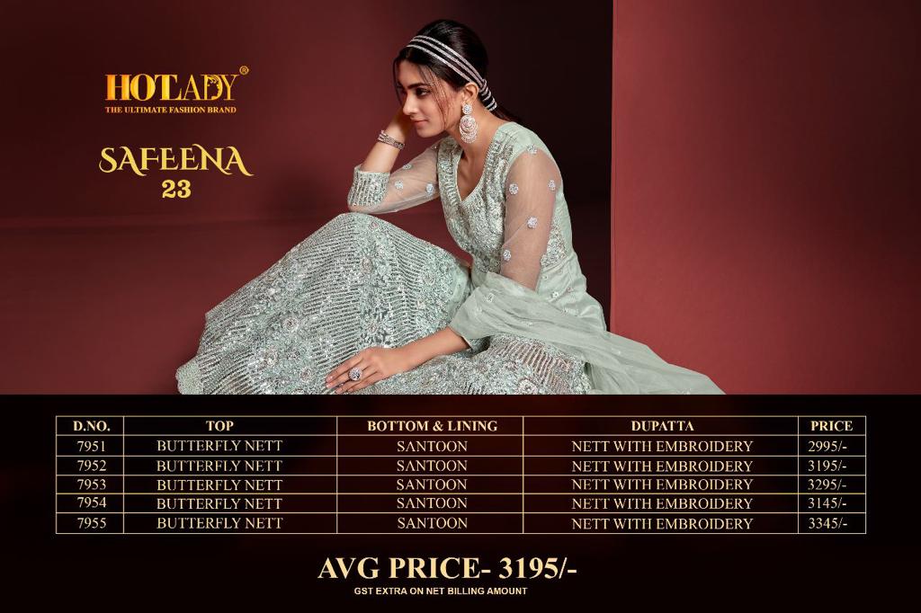 Buy Online Safeena Vol 23 Series 7951 To 7955 By Hotlady 5 Pcs of Full Catalogue at Wholesale Price. Looking for Safeena Vol 23 Series 7951 To 7955 By Hotlady Full Catalouge at Best Price? Buy Now Safeena Vol 23 Series 7951 To 7955 By Hotlady at Wholesale Rate of Rs 15975 with Total 5 Pcs from authroized dealer and supplier of HOTLADY Brand. Cost of Each piece is just only Rs 3195 which is very low and affordable price to resale the product in your retail store ,This is Surat based Wholesale Supplier & Dealer of HOTLADY Brand. Click on Brand name to Know more about HOTLADY Brand's products.Call or Whatsapp on 9898838984 for booking or enquiry