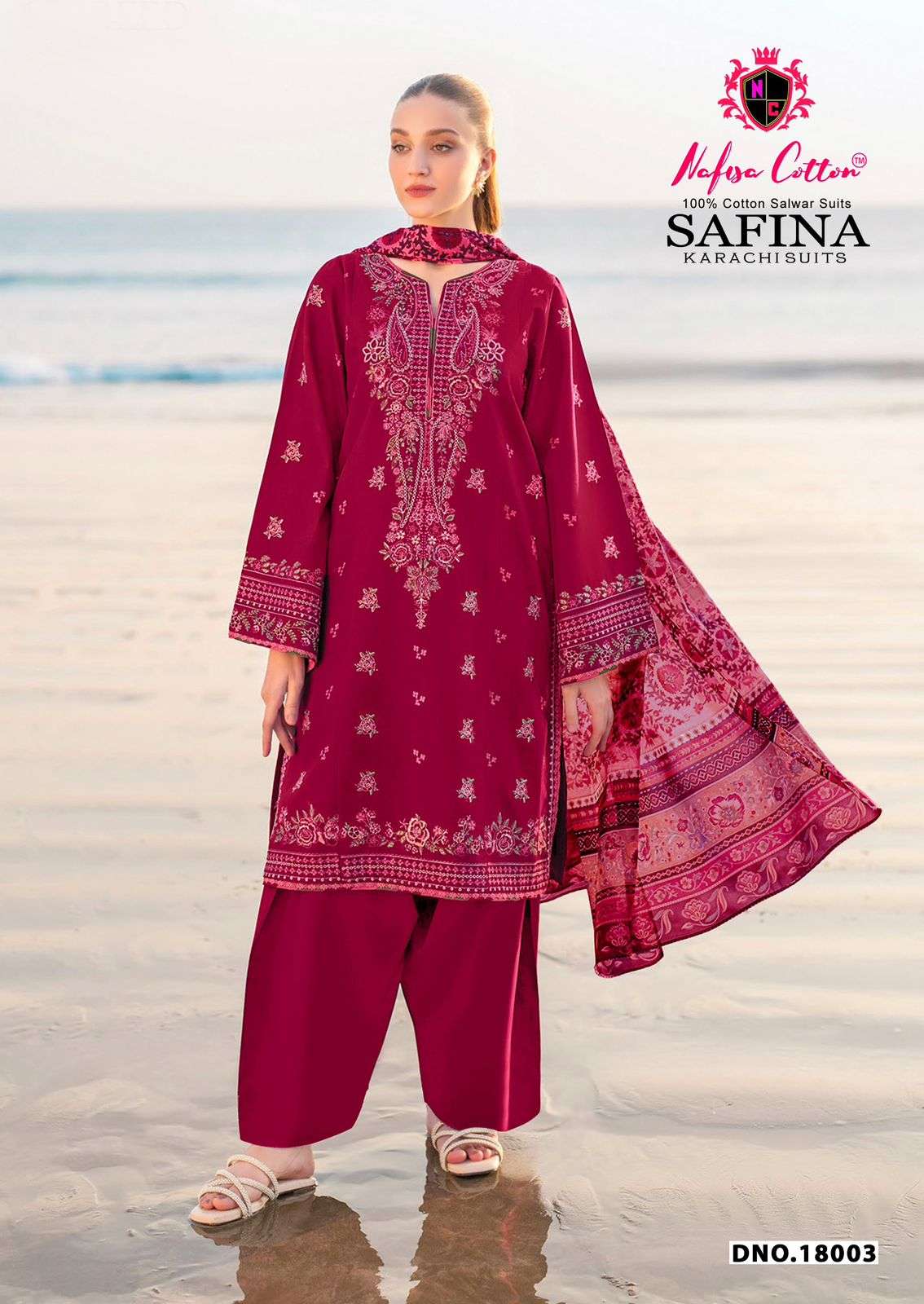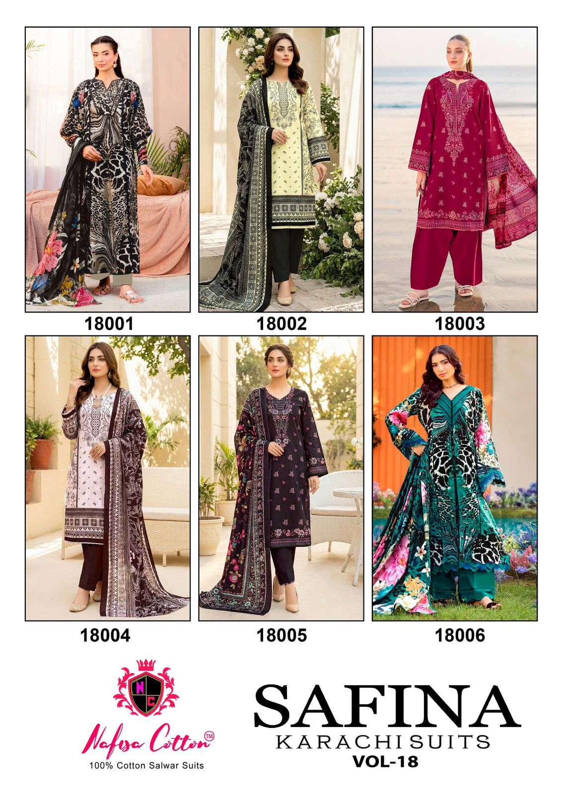 Buy Online SAFINA KARACHI SUITS VOL 18 by NAFISHA COTTON suit collection manufacturers surat 6 Pcs of Full Catalogue at Wholesale Price. Looking for SAFINA KARACHI SUITS VOL 18 by NAFISHA COTTON suit collection manufacturers surat Full Catalouge at Best Price? Buy Now SAFINA KARACHI SUITS VOL 18 by NAFISHA COTTON suit collection manufacturers surat at Wholesale Rate of Rs 1650 with Total 6 Pcs from authroized dealer and supplier of BRAND'S Brand. Cost of Each piece is just only Rs 275 which is very low and affordable price to resale the product in your retail store ,This is Surat based Wholesale Supplier & Dealer of BRAND'S Brand. Click on Brand name to Know more about BRAND'S Brand's products.Call or Whatsapp on 9898838984 for booking or enquiry