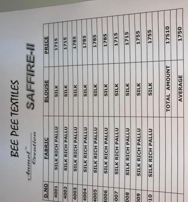 Buy Online Safire Anmol Series 4001 To 4010 Silk Sarees Set And Single Wholesale Supplier Gujarat 10 Pcs of Full Catalogue at Wholesale Price. Looking for Safire Anmol Series 4001 To 4010 Silk Sarees Set And Single Wholesale Supplier Gujarat Full Catalouge at Best Price? Buy Now Safire Anmol Series 4001 To 4010 Silk Sarees Set And Single Wholesale Supplier Gujarat at Wholesale Rate of Rs 17500 with Total 10 Pcs from authroized dealer and supplier of BRAND'S Brand. Cost of Each piece is just only Rs 1750 which is very low and affordable price to resale the product in your retail store ,This is Surat based Wholesale Supplier & Dealer of BRAND'S Brand. Click on Brand name to Know more about BRAND'S Brand's products.Call or Whatsapp on 9898838984 for booking or enquiry