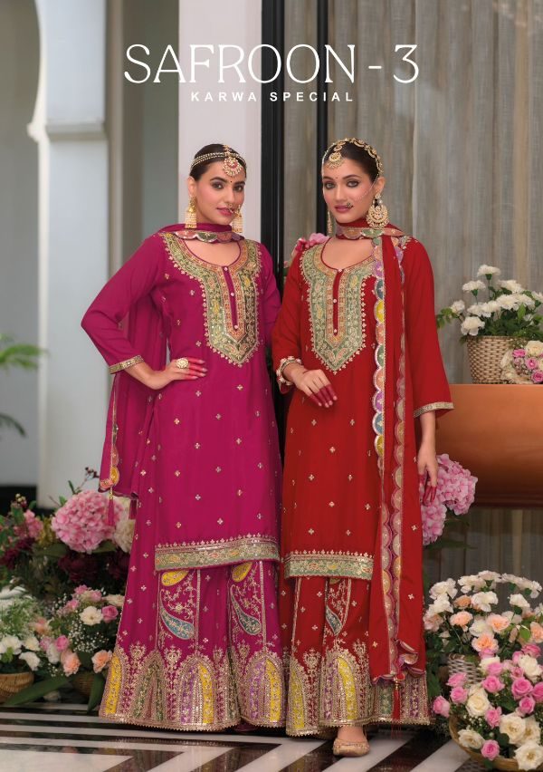 Hello Dear customer Now volume SAFROON vol-3 ( karwa chouth special) Top - hevey Chinon with emboidery work Duppta- hevey Chinon with emboidery work plazo - hevey Chinon with emboidery ( front & back work ) RATE - 2399/- GST EXTRA Size - M(38)' L(40)' XL(42)' 2XL (44)' 3XL(46) 100+ SINGLE |