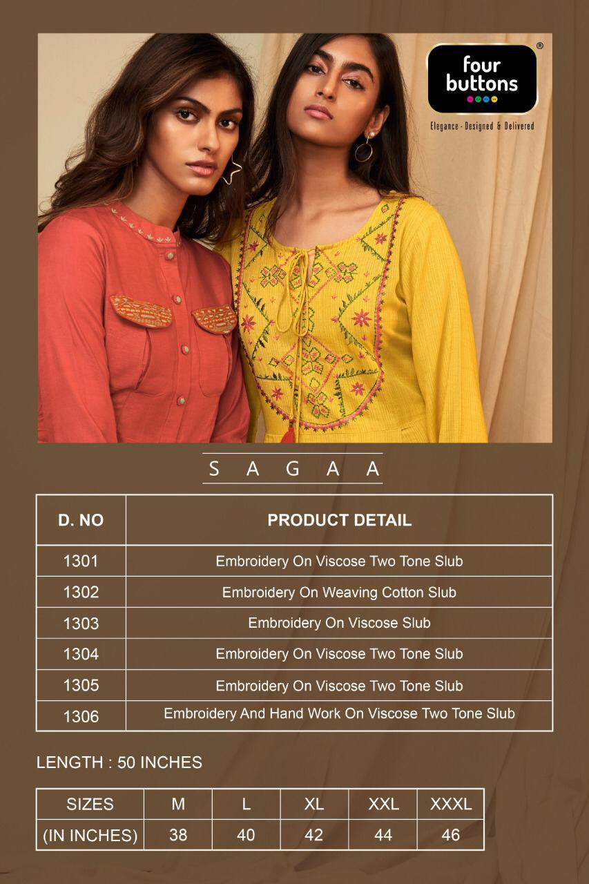 Buy Online Sagaa By Four Buttons Fancy Designer Kurtis Wholesale Supplier Surat 6 Pcs of Full Catalogue at Wholesale Price. Looking for Sagaa By Four Buttons Fancy Designer Kurtis Wholesale Supplier Surat Full Catalouge at Best Price? Buy Now Sagaa By Four Buttons Fancy Designer Kurtis Wholesale Supplier Surat at Wholesale Rate of Rs 5370 with Total 6 Pcs from authroized dealer and supplier of FOUR BUTTONS Brand. Cost of Each piece is just only Rs 895 which is very low and affordable price to resale the product in your retail store ,This is Surat based Wholesale Supplier & Dealer of FOUR BUTTONS Brand. Click on Brand name to Know more about FOUR BUTTONS Brand's products.Call or Whatsapp on 9898838984 for booking or enquiry