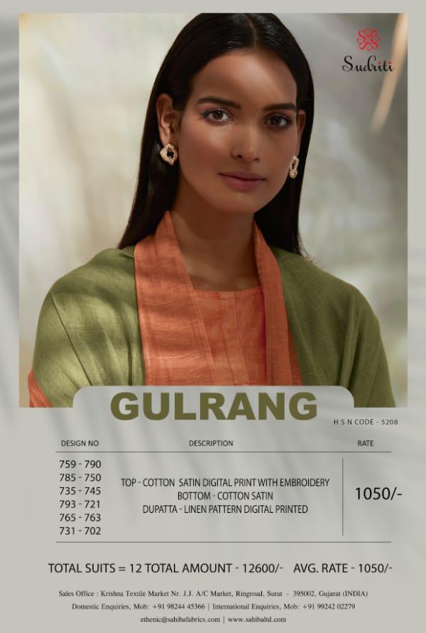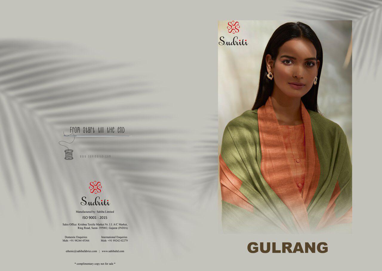 Buy Online Sahiba Sudriti Gulrang Designer Party Wear Suits Wholesale Supplier Gujarat 12 Pcs of Full Catalogue at Wholesale Price. Looking for Sahiba Sudriti Gulrang Designer Party Wear Suits Wholesale Supplier Gujarat Full Catalouge at Best Price? Buy Now Sahiba Sudriti Gulrang Designer Party Wear Suits Wholesale Supplier Gujarat at Wholesale Rate of Rs 12600 with Total 12 Pcs from authroized dealer and supplier of SUDRITI Brand. Cost of Each piece is just only Rs 1050 which is very low and affordable price to resale the product in your retail store ,This is Surat based Wholesale Supplier & Dealer of SUDRITI Brand. Click on Brand name to Know more about SUDRITI Brand's products.Call or Whatsapp on 9898838984 for booking or enquiry