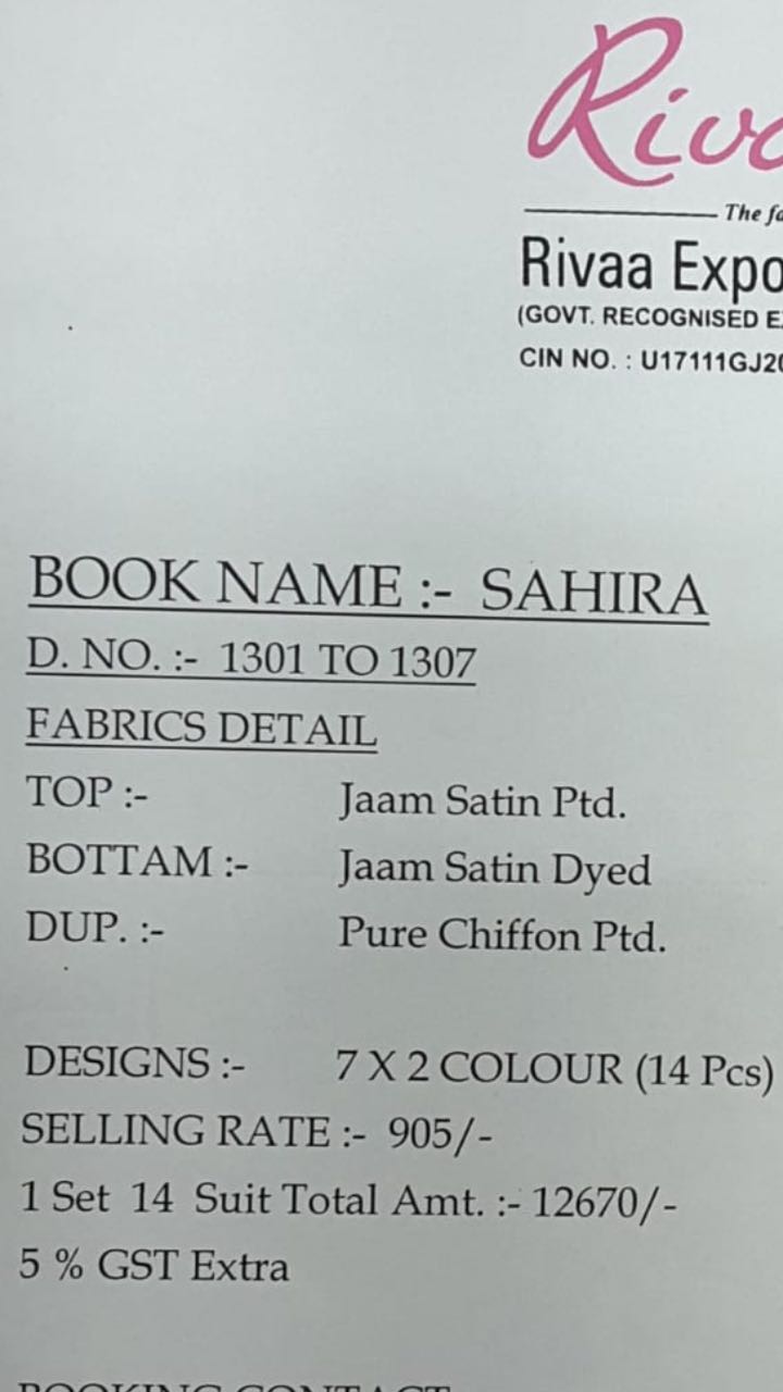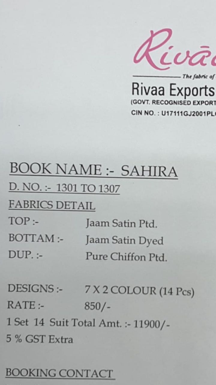 Buy Online Sahira By Rivaa Jam Satin Printed Suits Wholesale Supplier And Dealer Gujarat 14 Pcs of Full Catalogue at Wholesale Price. Looking for Sahira By Rivaa Jam Satin Printed Suits Wholesale Supplier And Dealer Gujarat Full Catalouge at Best Price? Buy Now Sahira By Rivaa Jam Satin Printed Suits Wholesale Supplier And Dealer Gujarat at Wholesale Rate of Rs 11900 with Total 14 Pcs from authroized dealer and supplier of RIVAA Brand. Cost of Each piece is just only Rs 850 which is very low and affordable price to resale the product in your retail store ,This is Surat based Wholesale Supplier & Dealer of RIVAA Brand. Click on Brand name to Know more about RIVAA Brand's products.Call or Whatsapp on 9898838984 for booking or enquiry